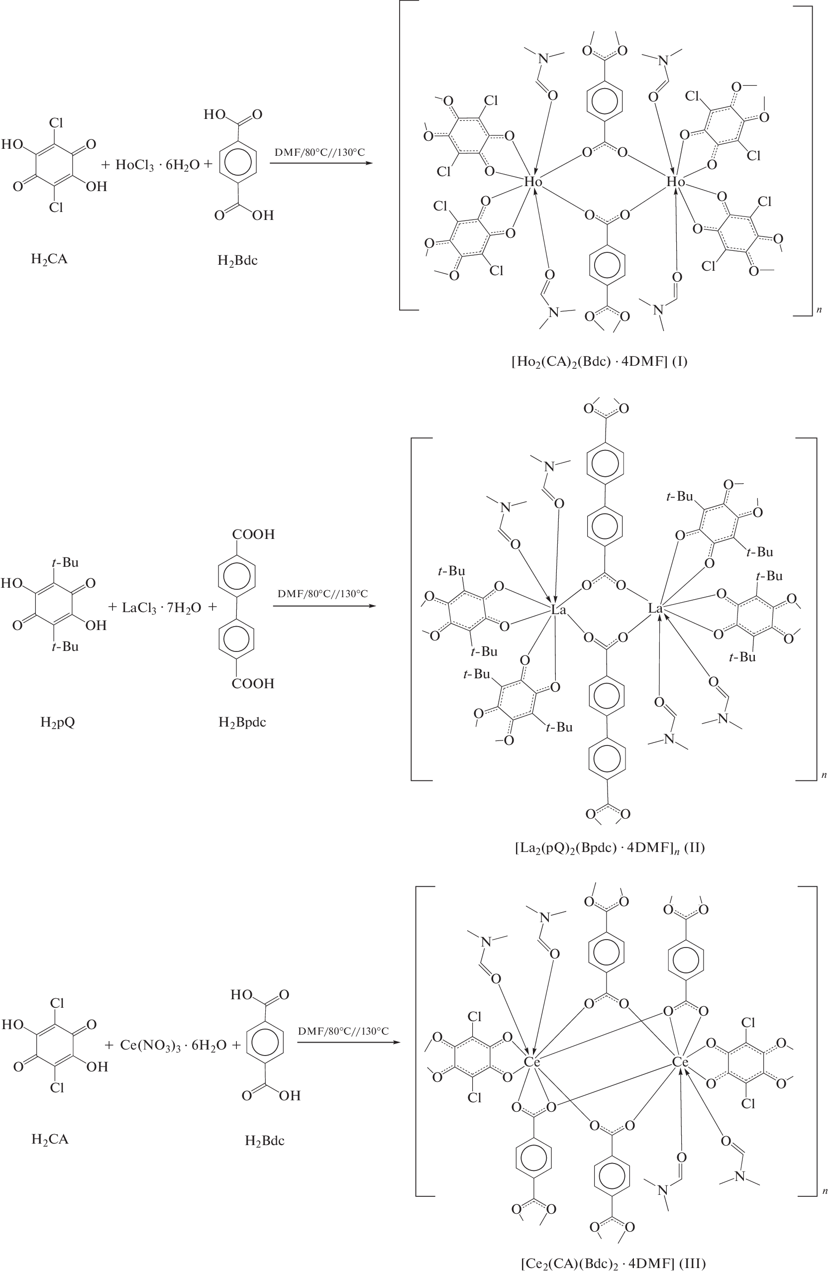 New heteroleptic metal-organic frameworks of lanthanides, units of which contain anionic organic ligands of two types, are prepared by the solvothermal synthesis in N,N-dimethylformamide (DMF). The cross-linked coordination polymer [Ho2(CA)2(Bdc)·4DMF] (I) and two scaffold derivatives [La2(pQ)2(Bpdc)·4DMF] (II) and [Ce2(CA)(Bdc)2·4DMF]·2DMF (III·2DMF), where CA is chloranilic acid dianion, pQ is 2,5-dihydroxy-3,6-di-tert-butyl-para-benzoquinone dianion, Bdc is terephthalic acid dianion, and Bpdc is 4,4'-biphenyldicarboxylic acid dianion, are synthesized. The structures of compounds I, II, and III·2DMF are studied by X-ray diffraction (XRD) (CIF file CCDC nos. 2212230, 2212231, and 2212232, respectively).