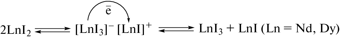 The reaction of thulium shavings with iodine at 680°C gave a poorly separable product mixture A, consisting of thulium metal (65%), TmI2 (14%), and TmI (21%). Monovalent thulium iodide could not be isolated in a pure state, but its presence among the products was confirmed, apart from magnetic measurements, by reactions with naphthalene and perylene, which proceed under mild conditions. The reaction of TmI with naphthalene, which takes place at –40°C, affords the trivalent thulium complex with naphthalene dianion, [TmI(C10H8)(DME)3]. The multistep reaction with perylene starts with the formation of the divalent thulium radical anion complex, [(TmI)+(C20H12)–•(DME)3], and ends in the formation of trivalent thulium complex, [(TmI)2+(C20H12)2–(DME)3]. The presence of a radical anion intermediate in the reaction mixture in an early stage was confirmed by ESR spectroscopy.