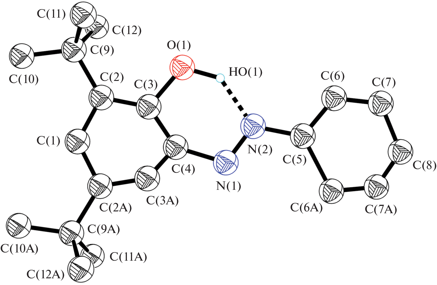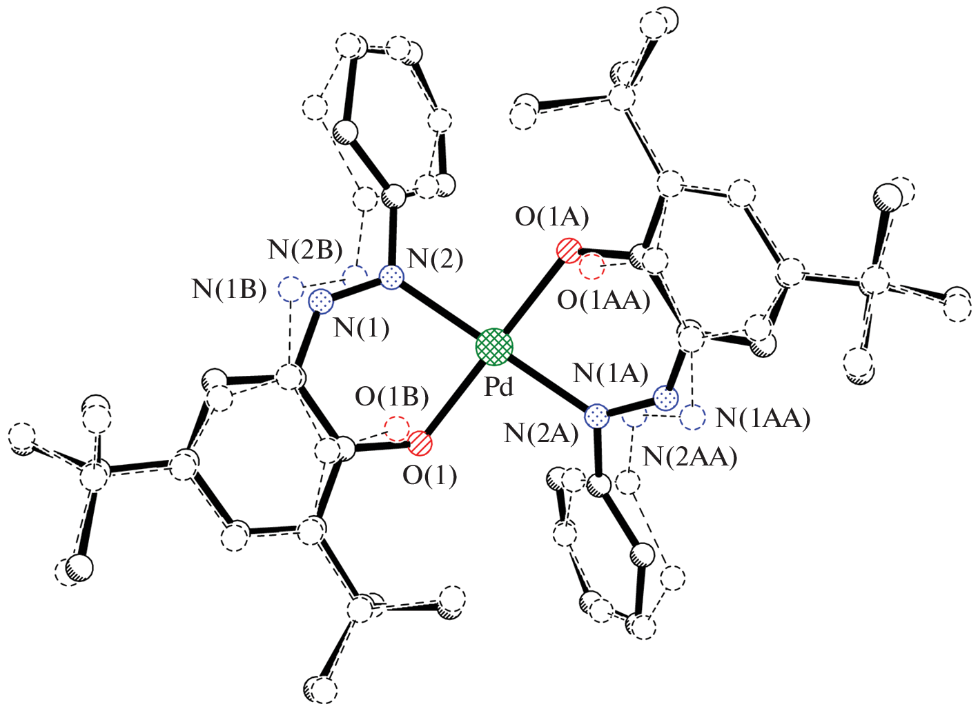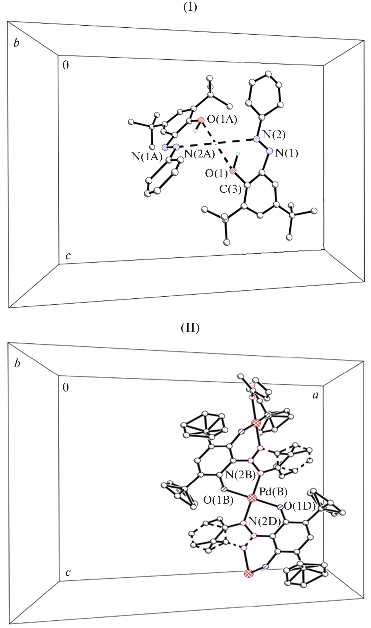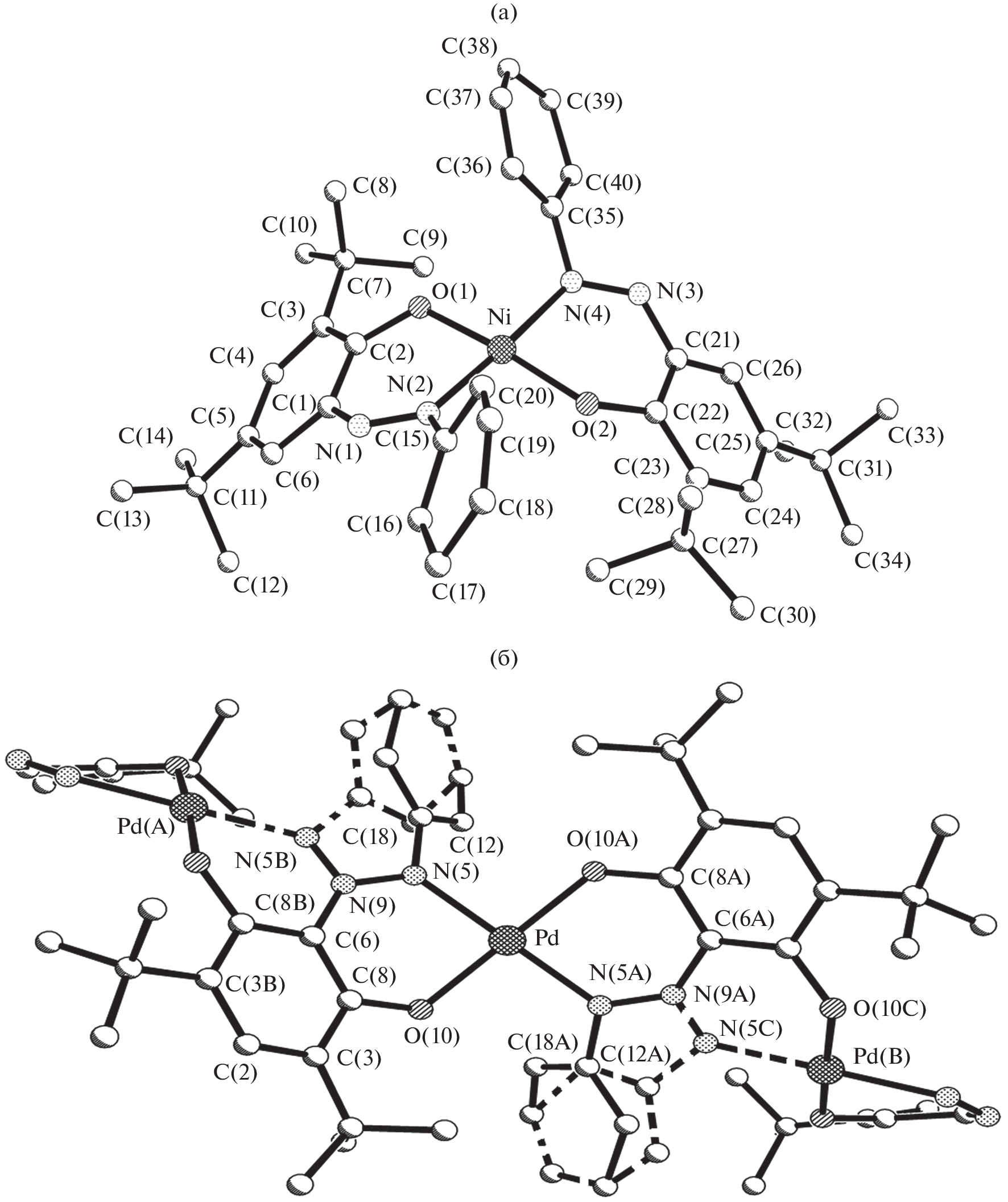 The structures of 3,5-di-(tert-butyl)-2-hydroxyazobenzene (L) in the free state and in complexes with Ni2+ (I) and Pd2+ (II) cations are studied by X-ray diffraction (XRD). The same space group R3¯с with close unit cell parameters, the same crystal structure motif, and unusual conformations of the cupola-shaped coordination polyhedra of complexes I and II are revealed by XRD for ligand L. In complexes I and II based on this compound as the ligand, the coordinating atoms form trans-planar coordination nodes.