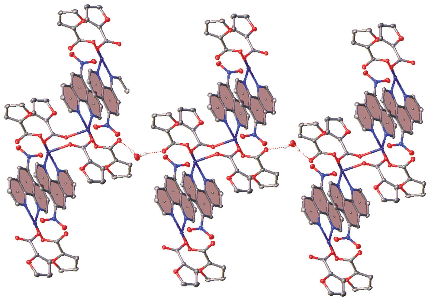 The reaction of copper(II) acetate with 2-furancarboxylic (HFur)/5-nitro-2-furancarboxylic (HNfur) acids and 5-nitro-1,10-phenanthroline (Nphen) in methanol resulted in the formation of the binuclear coordination compounds [Cu2(L)4(Nphen)2]·X (L = Fur (I), Nfur (II); X = H2O (I)), which were structurally studied by direct X-ray diffraction (CCDC no. 2244205 (I) and 2244206 (II)). According to X-ray diffraction data, the coordination environment of the central metal ion in I and II is composed of two nitrogen atoms of Nphen and three oxygen atoms of the acid anions, which thus form the {CuN2O3} tetragonal pyramid in which the copper coordination number is five. Intermolecular hydrogen bonds and stacking interactions between the Nphen aromatic rings provide supramolecular stabilization of I and II. A characteristic feature of supramolecular organization of II is the presence of a coordination bond between the Cu2+ cation and oxygen of the Nphen NO2- group of parallel chains. A biological activity assay for complexes I and II concerning the cytotoxic properties against a human ovarian adenocarcinoma cell line (SKOV3) and the mycobacterial strain Mycolicibacterium smegmatis showed an efficient suppression of cell viability. The results of mathematical modeling of the probability of Cu2+ binding to amino acid residues of M. smegmatis proteins suggested the affinity of the Cu(II) ion to a number of amino acids in polypeptide sites. It was shown that metal ion binding in mycobacterial proteins is more characteristic of histidine- and glutamic acid-containing moieties.