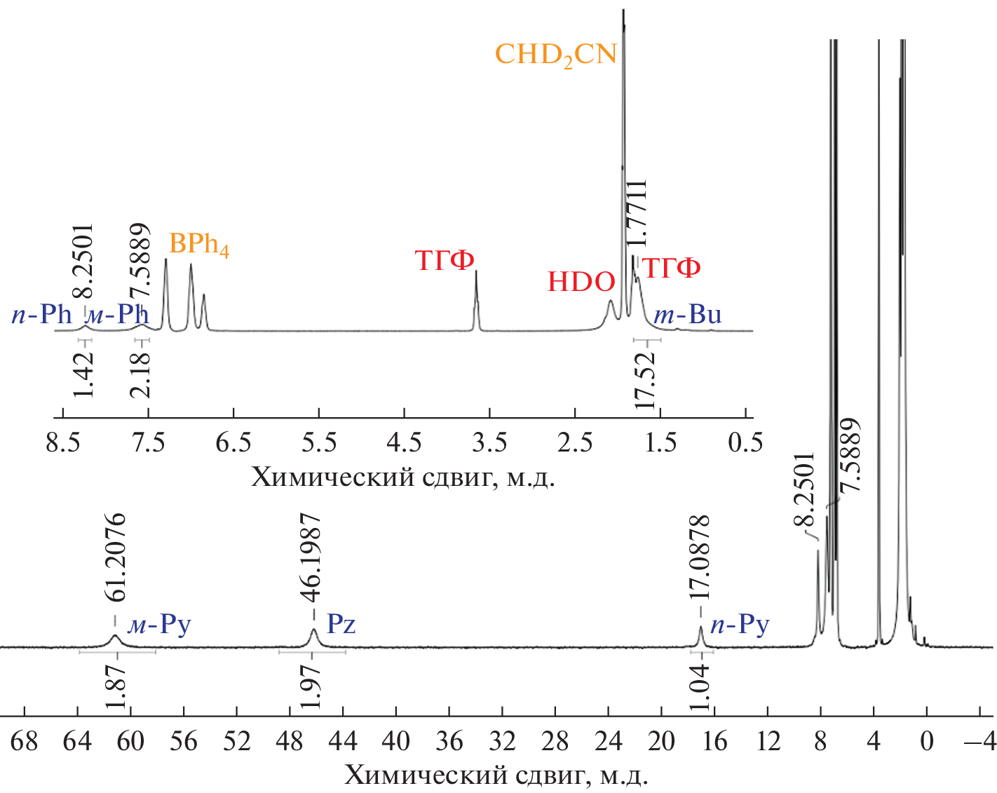 При взаимодействии N,N'-дизамещенного 2,6-бис(пиразол-3-ил)пиридинового лиганда (L) с солью двухвалентного никеля получен новый комплекс никеля(II) [Ni(L)(H2O)(THF)Cl]BPh4 (I), который выделен в индивидуальном виде и охарактеризован при помощи элементного анализа, масс-спектрометрии, спектроскопии ЯМР и рентгеновской дифракции (CCDC № 2221412). Согласно данным спектроскопии ЯМР, в сочетании с результатами квантовохимических расчетов, комплекс I в растворе не проявляет эффекта переноса насыщения.