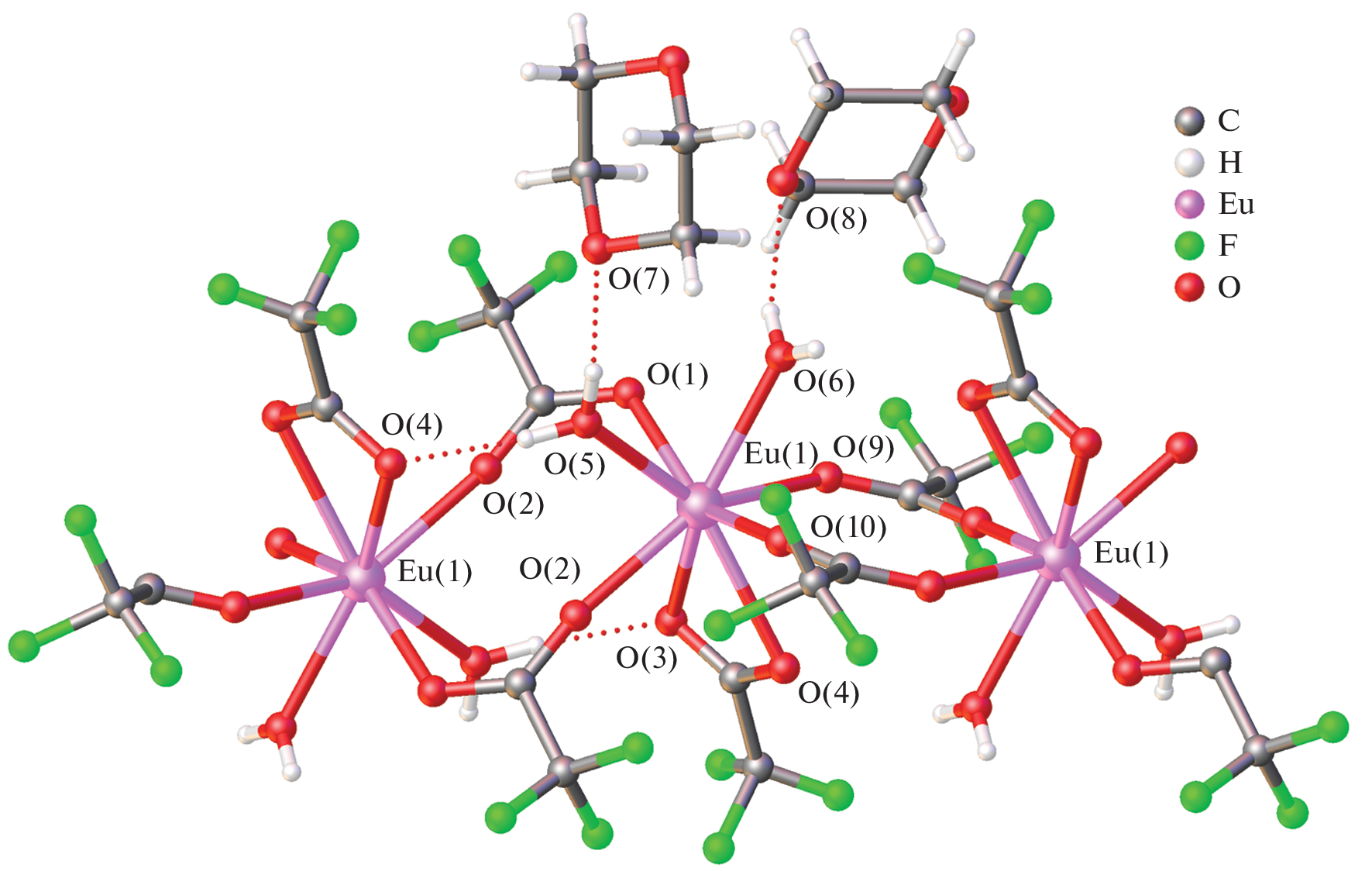 Показано, что кипячение водного ацетата европия(III) с трифторуксусной кислотой в смеси диоксан-ацетонитрил приводит к образованию полимера {[Eu(μ-OOCCF3)3(OH2)2]}n (I), содержащего сольватные молекулы диоксана. При взаимодействии I с [Phen2Zn2(µ-OOCtBu)2(OOCtBu)2] (II) (Phen = 1,10-фенантролин) в CH2Cl2 при комнатной температуре образуется осадок, перекристаллизация которого из ацетонитрила дает необычный трехъядерный гетерометаллический гетероанионный комплекс Phen2Zn2Eu(µ3-OН)(OOCtBu)4(OOCCF3)2 (III). Строение полученных соединений установлено по данным РСА (CCDC № 2235937–2235939). Для комплекса III исследованы оптические свойства.
