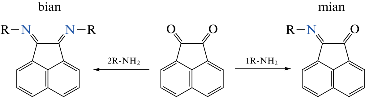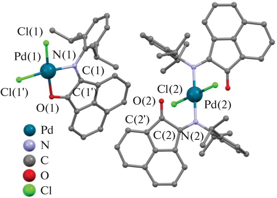 When PdCl2 reacts with [2,6-diisopropylphenyl]iminoacenaphthenone (dpp-mian) in dichloromethane, the compound 2[Pd(dpp-mian)Cl2]*[Pd(dpp-mian)2Cl2] (1) is formed. It contains two structural units: [Pd(dpp-mian)Cl2], in which dpp-mian is coordinated to Pd(II) in a bidentate-chelate manner by nitrogen and oxygen atoms, and [Pd(dpp-mian)2Cl2], in which two dpp-mian molecules are bonded to palladium only through a nitrogen atom. On the other hand, when PdCl2 interacts with [4-methoxyphenyl]iminoacenaphthenone (4-MeOPh-mian) in dichloromethane, a rearrangement of the ligand structure occurs, followed by the formation of the previously described in the literature complex of Pd(II) with 1,2-bis-[4-methoxyphenyl ]iminoacenaphthene (4-MeOPh-bian) of the composition [Pd(4-MeOPh-bian)Cl2] (2). Compound 1 was obtained for the first time and characterized by X-ray diffraction, as well as by X-ray diffraction, elemental analysis, IR spectroscopy and cyclic voltammetry.