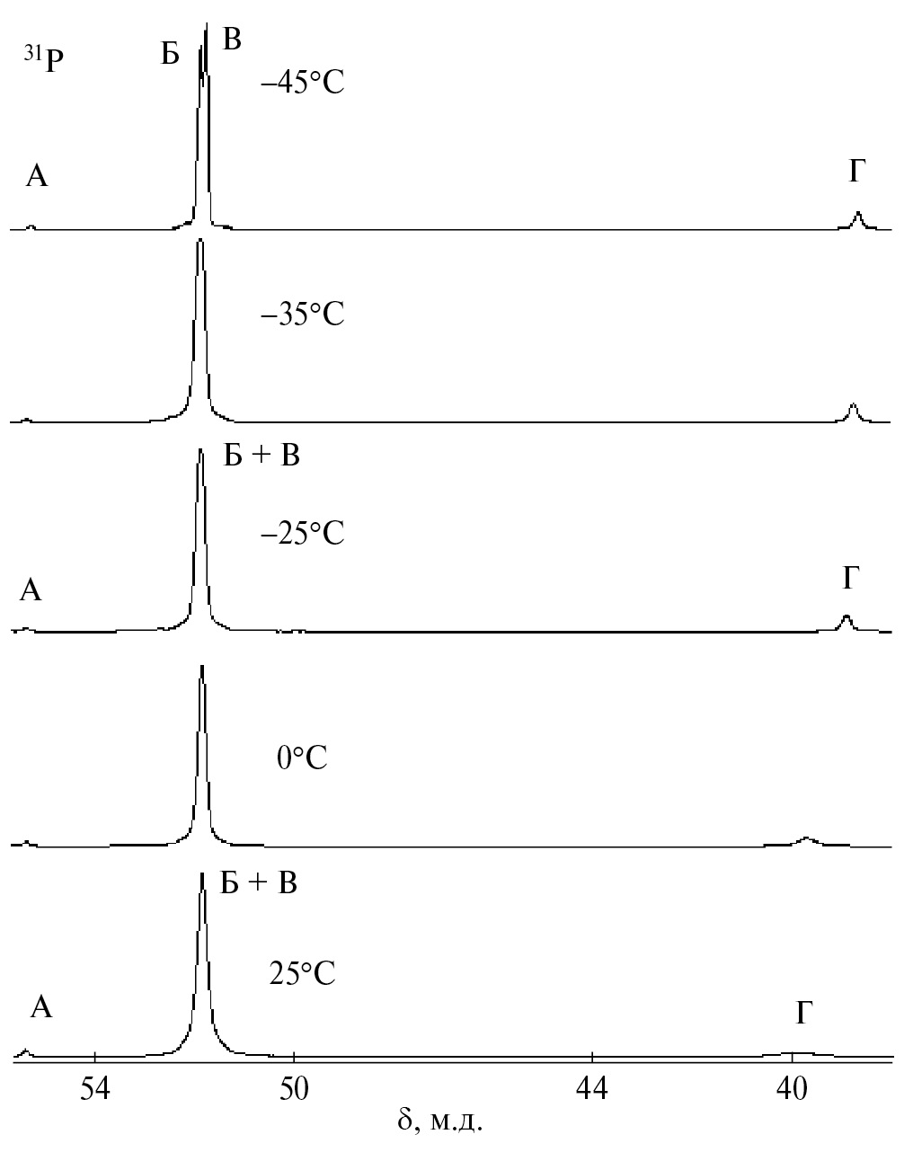 Рис. 4. Температурная зависимость спектров ЯМР 31P{1H} раствора TiF4 + 2L в СН2Сl2. А — сигнал транс-TiF4L2, Б, В — линии рацемических и мезо-диастереоизомеров цис-TiF4L2, Г — сигнал свободного лиганда.