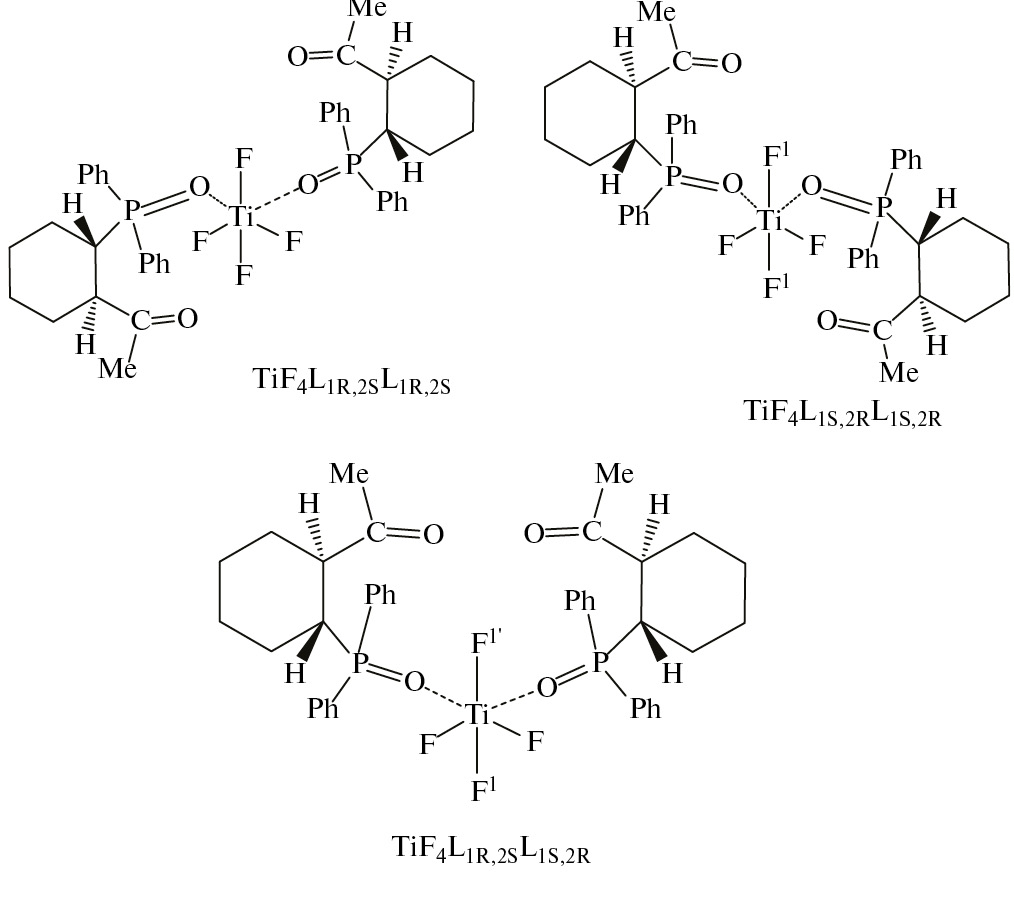 Стереоизомеры октаэдрического цис-тетрафторокомплекса d0-переходного элемента впервые удалось наблюдать методом ЯМР 19F при изучении продуктов реакции TiF4 c монодентатным лигандом Ph2P(O)CH2CH(OH)Me (L') [9], содержащим в углеводородном радикале один асимметрический атом углерода и представляющим собой рацемическую смесь двух энантиомеров. Было показано, что в растворе образуются рацемические – (TiF4L'RL'R + TiF4L'SL'S) и мезо-(TiF4L'RL'S) диастереомеры комплексов цис- и транс-TiF4L'2. Стереохимия комплексообразования TiF4 с ациклическим дифенилфосфорилалканоном Ph2P(O)СНМеСН2С(О)Et (L''), в котором хиральный атом углерода связан непосредственно с атомом фосфора лиганда, носит аналогичный характер [10].