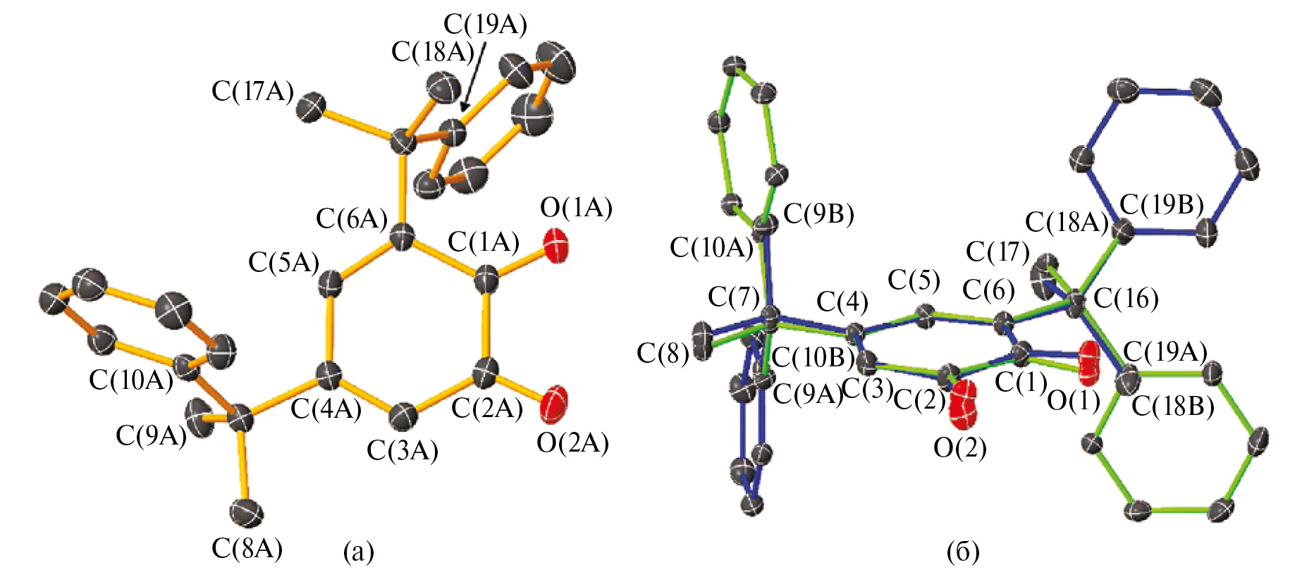 Рис. 1. Строение молекулы А о-бензохинона L4 (приведены тепловые эллипсоиды 30%-ной вероятности) а; б – суперпозиция структур молекул A и B (зеленые и синие связи соответственно) соединения L4 с тепловыми эллипсоидами атомов 15%-ной вероятности (атомы водорода не показаны).