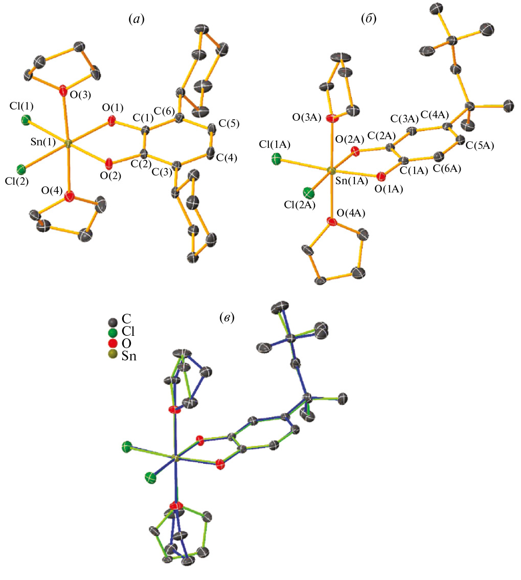 Общая методика синтеза комплексов I–IV на основе замещенных о-бензохинонов. Раствор замещенного o-бензохинона (1 экв) в ТГФ (10 мл) добавляли к раствору SnCl2 · dioxane (1 экв) в 20 мл того же растворителя. Цвет реакционной смеси менялся от зеленого до желтого или коричневого. ТГФ упаривали при пониженном давлении досуха и остаток растворяли в смеси растворителей CH2Cl2-гексан в соотношении 1 : 1. Комплексы олова(IV) выделяли в виде желтых мелкокристаллических осадков, после выдерживания раствора при –18°C в течение ночи. Пригодные для РСА кристаллы получили для комплексов I и III. Все полученные катехолатные комплексы олова I – IV чувствительны к кислороду и влаге воздуха в растворе и твердом состоянии.