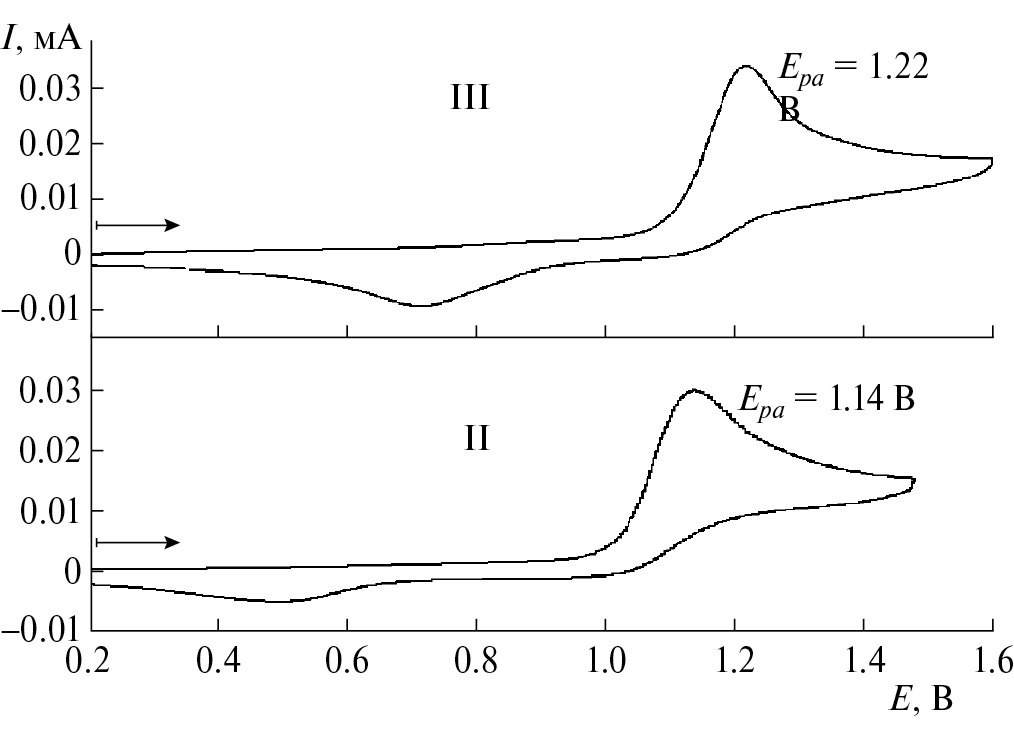 Рис. 3. Кривые ЦВА для комплексов II и III (стеклоуглеродный электрод, Ag/AgCl/KCl, 0.2 M [n-Bu4N]ClO4, CH2Cl2, c = 2 × 10–3 моль/л, V = 0.2 В/с, Ar).
