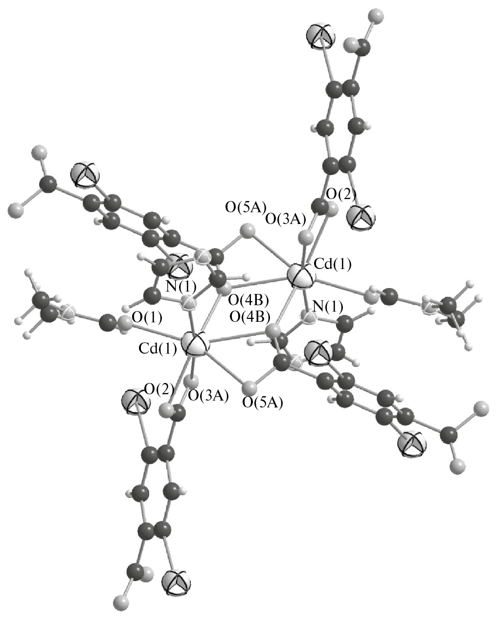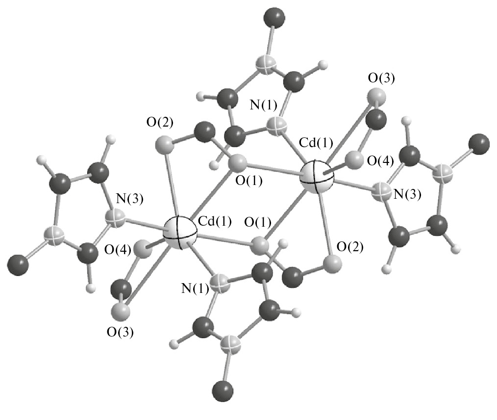 Рис. 4. Строение биядерного строительного блока {Cd2(2,5-I-Bdc)Bbi(DMF)2} в кристаллической структуре комплекса II.