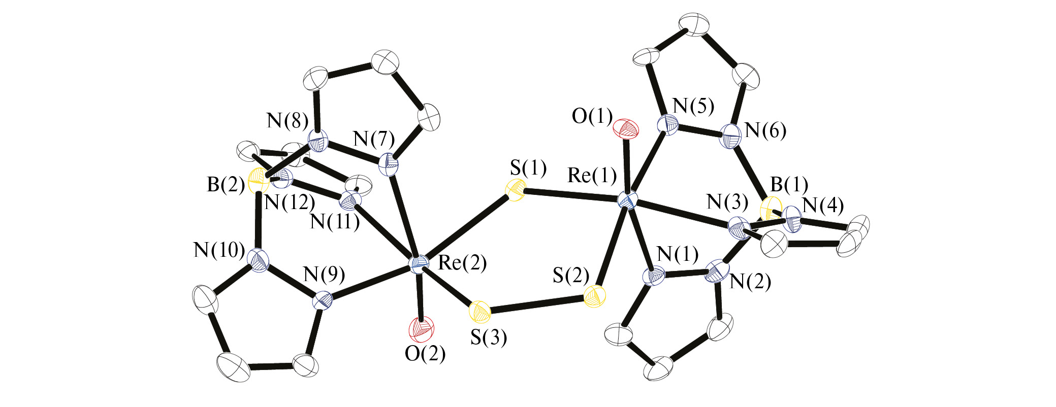Трис(пиразолил)боратные анионы, являющиеся тридентатными лигандами и образующие стабильные комплексы с переходными металлами, нашли широкое применение в координационной химии [1]. Комплексы рения с трис(пиразолил)боратным и тиолатными лигандами подробно изучались в качестве модели для каталитических процессов десульфирования [2], однако из комплексов с сульфидными лигандами был получен только Tp*ReSCl2, не охарактеризованный структурно [3]. Трис(пиразолил)боратные комплексы рения с дисульфидным лигандом не были описаны, а количество таких комплексов с другими металлами не велико.