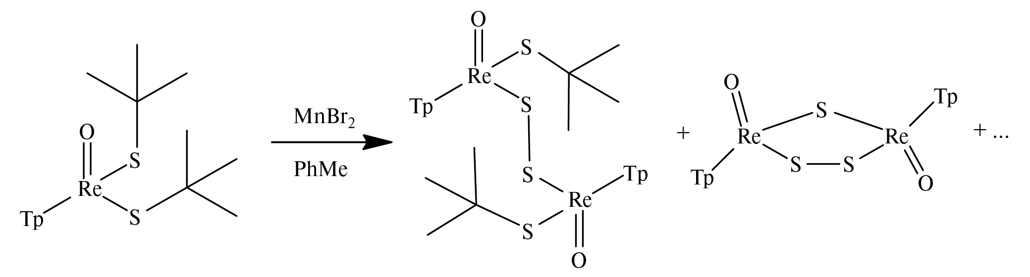 Реакция TpReO(StBu)2 c избытком суспензии бромида марганца в толуоле при 80°C приводит к образованию нового комплекса [TpReO(µ-StBu)]2(µ-S2 (I), который может быть отделен хроматографически от непрореагировавшего исходного. Попытки увеличить время реакции или избыток MnBr2 приводят к образованию ряда неидентифицированных побочных продуктов, затрудняющих выделение комплекса, среди которых один из продуктов дальнейшего деалкилирования и десульфирования был охарактеризован по данным РСА как [TpReO]2(µ-S2)(µ-S) (II), содержащий сульфидный и дисульфидный мостиковые лиганды. Аналогичная реакция с безводным MnCl2 приводит к образованию только незначительных количеств TpReOCl(StBu) [8], идентифицированного с помощью ТСХ в сравнении с эталоном (схема 1).