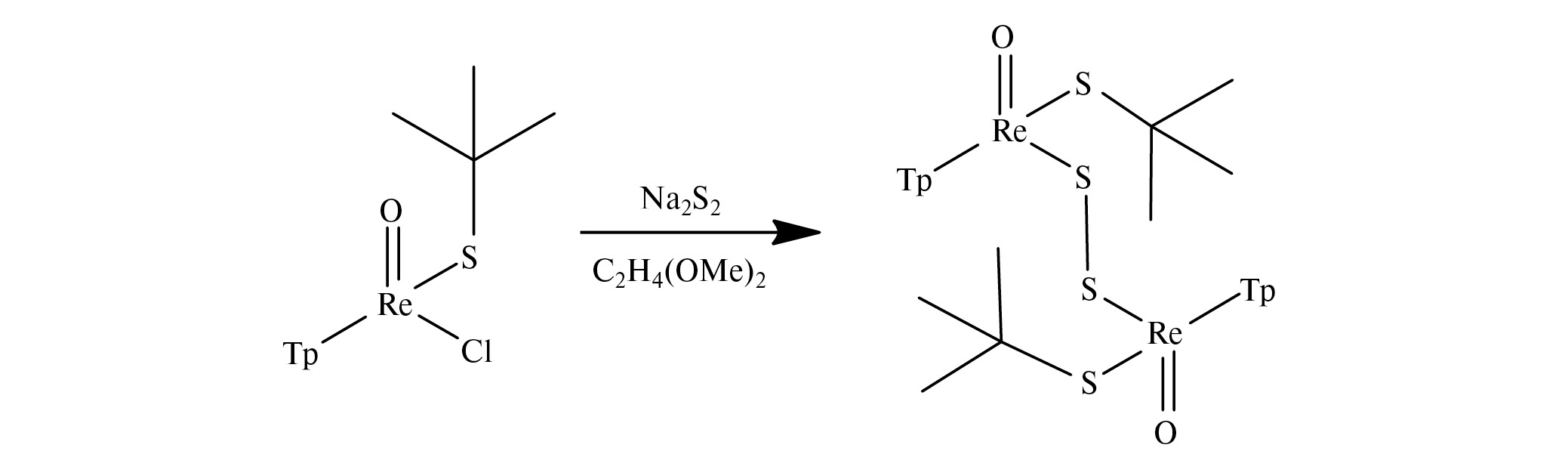 Комплекс I также может быть получен замещением хлоридного лиганда в TpReOCl(StBu) при действии дисульфид-аниона. Наилучший выход составил только 16% при проведении реакции c избытком Na2S2 в диметоксиэтане. При этом образуется также смесь неидентифицированных не растворимых в толуоле или CH2Cl2 продуктов, кристаллизация которых из диметилформамида с диэтиловым эфиром с добавкой хлорида тетрафенилфосфония позволяет выделить небольшое количество красно-оранжевых кристаллов с параметрами ячейки, близкими к [Ph4P][ReS4] [24]. Проведение реакции с более растворимым Li2S2 в тетрагидрофуране приводит к быстрому исчезновению исходного комплекса, но I образуется только в следовых количествах по данным ТСХ (схема 2).