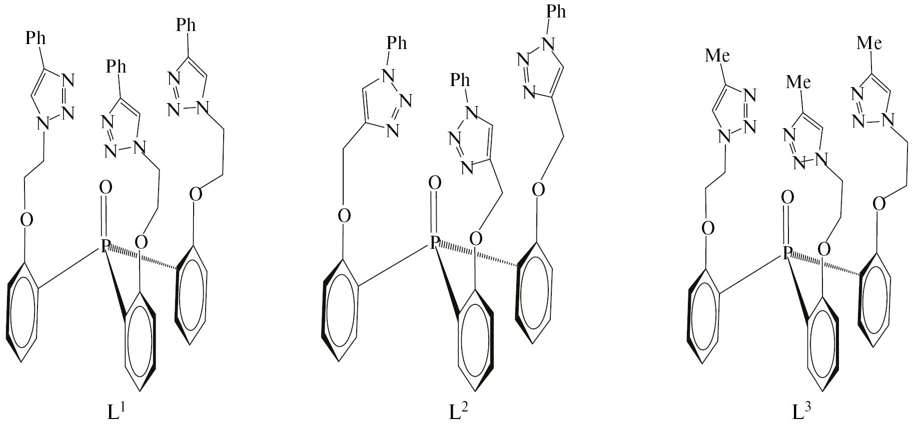 В настоящей работе, используя колебательную и ЯМР-спектроскопию, а также квантово-химические расчеты, мы анализируем, как 1,2,3-триазольный фрагмент родственных триподальных лигандов — трис{2-[2′-(4′′-фенил-1′′,2′′,3′′-триазол-1′′-ил)этокси]фенил}фосфиноксидa (L1), трис{2-[(1′′-фенил-1′′,2′′,3′′-триазол-4′′-ил)метокси]фенил}фосфиноксидa (L2), трис{2-[2′-(4′′-метил-1′′,2′′,3′′-триазол-1′′-ил)этокси]фенил}фосфиноксидa (L3) (схема 1) — участвует в координации с лантанидами в более сложном структурном контексте, когда другие триазольные фрагменты и Р(О)-группа платформы конкурируют за связывание с металлом. С этой целью мы сопоставили координационные и экстракционные свойства двух близкородственных лигандов L1 [14] и L2 [15], различающихся способом присоединения триазольного фрагмента и длиной линкера.