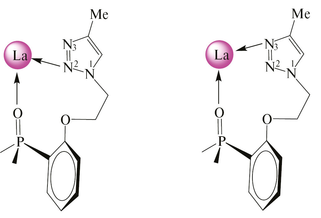 Таким образом, лиганды L1, L2, различающиеся способом присоединения 1,2,3-триазольного фрагмента и длиной линкера, в комплексах с нитратами лантанидов проявляют разные координационные свойства, основным различием которых является изменение способа N-координации триазольного фрагмента и дентатности лиганда. Вместо тетрадентатной P(O),N3,N3,N3-координации, найденной для комплексов L2 [15], в комплексах L1 наблюдается тридентатная P(O),N2,N2-координация. Это различие, найденное для твердых комплексов, сохраняется и в растворах (CD3CN, CDCl3).