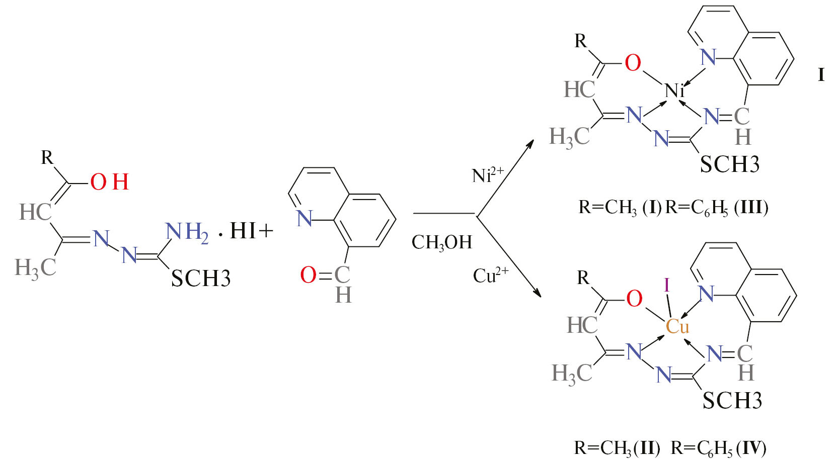В целях расширения ряда координационных соединений на основе производных тиосемикарбазида и 8-хинолинальдегида были получены и исследованы четыре новых моноядерных координационных соединения никеля(II) и меди(II) с асимметричными тетрадентатными [N3O] лигандами (HL1 и HL2), образующиеся при взаимодействии S-метилизотиосемикарбазона ацетил(бензоил)ацетона иодгидрата с 8-хинолинальдегидом — [NiL1]I (I), [CuL1I] (II), [NiL2] I (III) и [CuL2I] (IV) соответственно (схема 1). В отличие от ранее исследованных соединений в I—IV хинолинальдегидный фрагмент конденсирован не к гидразидному атому, а к амидному атому азота изотиосемикарбазидного фрагмента лиганда.