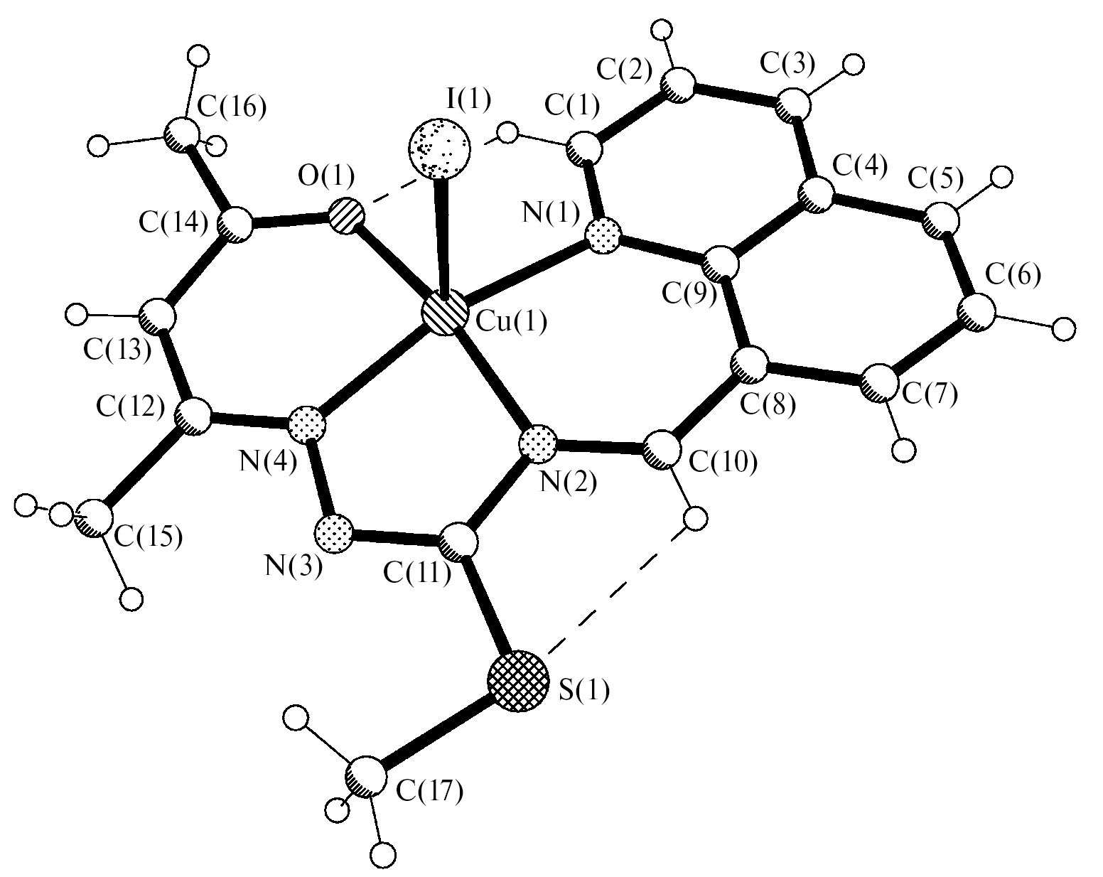 Синтез [СuL1I] (II). К теплому раствору 55—60˚С 0.32 г (1 ммоль) S-метилизотиосемикарбазона ацетилацетона иодгидрата и 1.6 г (1 ммоль) 8-хинолинальдегида в 20 мл метилового спирта добавляли 0.25 г (1 ммоль) Cu(CH3COO)2·H2O в 10 мл метилового спирта и 5 мл триэтиламина. Образовавшуюся коричневую реакционную смесь нагревали до 60—65˚С в течение 60 мин с обратным холодильником. При охлаждении выпадало кристаллическое вещество темно-коричневого цвета, которое отфильтровывали и промывали метанолом, а затем диэтиловым эфиром. Выход — ~67% (0.35 г). Тпл = 192—194˚C. Молекулярный пик в pESI масс-спектре: m/z = = 388 [M—I]+ (I, 100%).