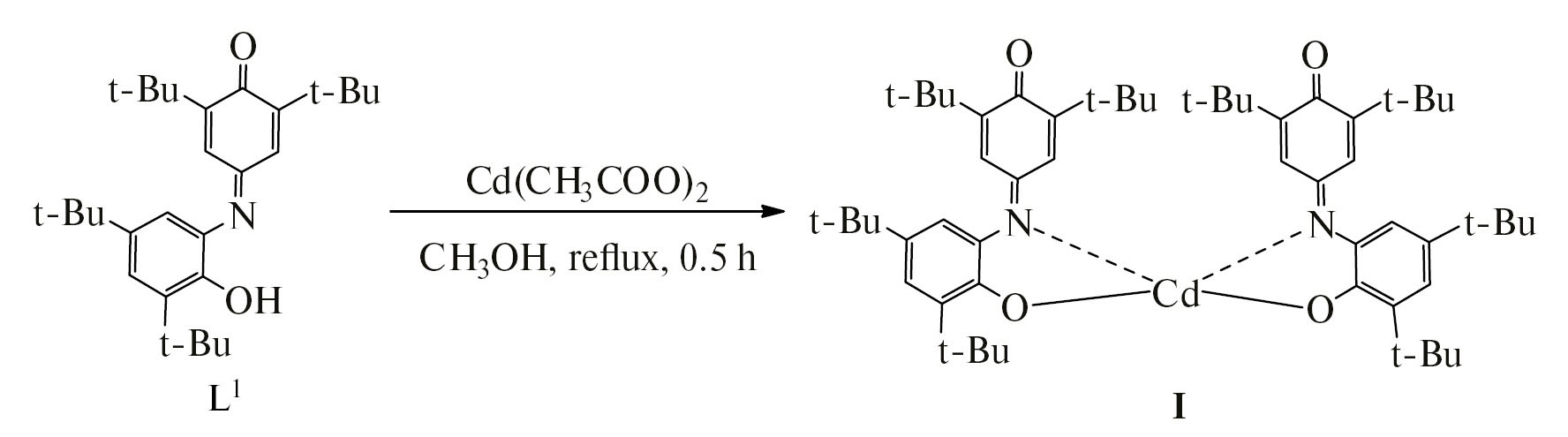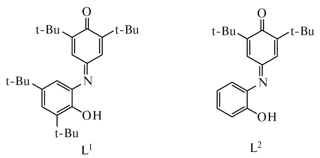 Возрастающий интерес к изучению строения и свойств координационных соединений кадмия, отнесенных Всемирной организацией здравоохранения, наряду с соединениями свинца и ртути, к числу трех наиболее токсичных типов веществ [1], в значительной степени обусловливается тем, что в последние годы удалось обнаружить комплексы Cd(II) с органическими лигандами, проявившие высокую антимикробную резистентность [2, 3] и повышенную активность против пораженных раком стволовых клеток [4]. Лиганды, образующие комплексы этого типа, преимущественно представлены полидентатными хелатирующими структурами на основе гидрокси- и тиопроизводных оснований Шиффа и гидразонов [3–9]. При этом представляется интересным использование лигандов с рассредоточенными редокс-активными центрами, способными не только координироваться с атомом металла, но и участвовать в окислительно-восстановительных процессах в связанном виде. В настоящей работе нами осуществлен синтез и изучено кристаллическое и молекулярное строение новых гексакоординированных комплексов Cd(II) с редокс-амфотерными 2,6-ди-(трет-бутил)-4-((2-гидроксифенил)имино)циклогекса-2,5-диеноновыми лигандами (L1 и L2), содержащими два активных редокс-центра, фенольный и п-хиноноиминовый [10, 11] (схема 1).