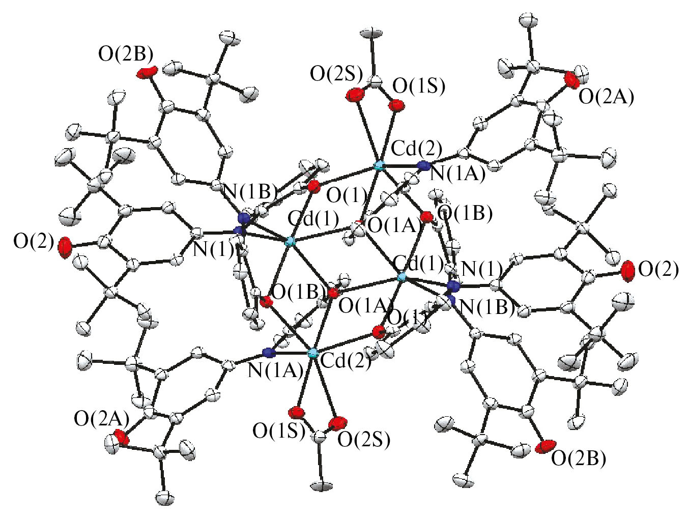 Как следует из данных рентгеноструктурного определения молекулярного строения комплекса III (рис. 3), шесть молекул лиганда L2 координированы четырьмя атомами кадмия двух типов и дополнительно двумя ацетатными фрагментами. Все четыре атома кадмия находятся в центре искаженных октаэдров. Атомы Cd(1) координируются двумя азотами (2.331 и 2.391 Å) и четырьмя кислородами четырех лигандов (2.230–2.362 Å), тогда как атомы Cd(2) координируются одним атомом азота (2.337 Å) и пятью атомами кислорода (2.247–2.372 Å) трех лигандов и одного ацетатного фрагмента. Необходимо отметить, что атомы О(1) и О(1В) одновременно координируют атом Cd(1) и атом Cd(2), тогда как атомы О(1А) одновременно координируют два атома Cd(1) и один атом Cd(2). Валентные углы в лигандах С(2)N(1)C(7) равны 121.42°, 121.28° и 124.09° соответственно. Плоскости фенольного и циклогексадиенонового циклов лигандов развернуты друг относительно друга на 44.30°, 35.93° и 40.76° соответственно. Длины связей C–O координационного узла (1.336(6)–1.347(7) Å) соответствуют катехолатной редокс-форме лиганда [13].