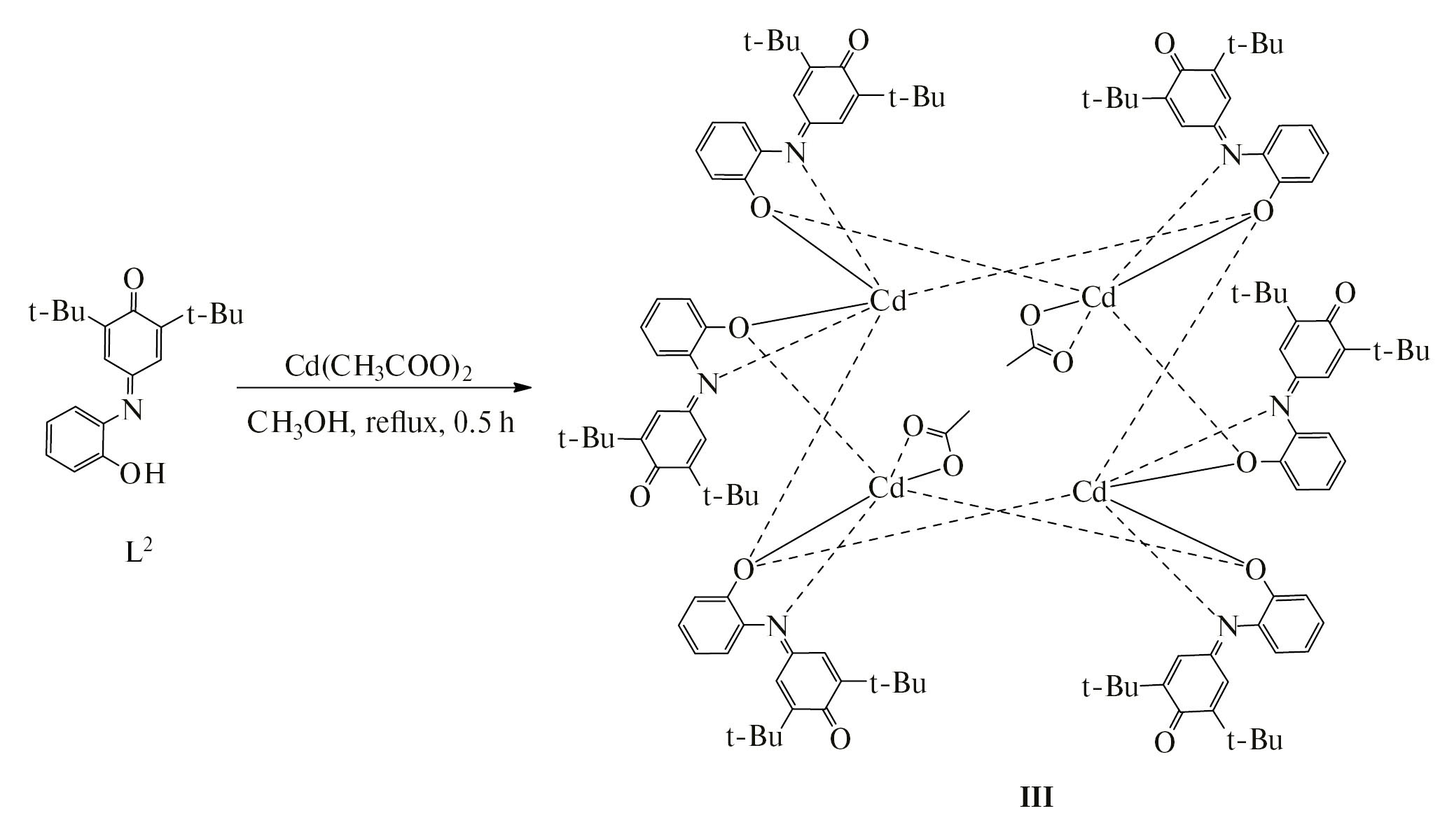 Ранее были описаны карбоксилатные комплексы кадмия(II), которые образуют кубические полиядерные структуры с четырьмя атомами кадмия и мостиковыми атомами кислорода [14–16], однако в случае комплекса III, вероятно, за счет стерического влияния индофенольных лигандов с объемными трет-бутильными формирование кубической структуры затруднено. При этом “внешние” атомы Cd(2) остаются координированными ацетатными группами [17].