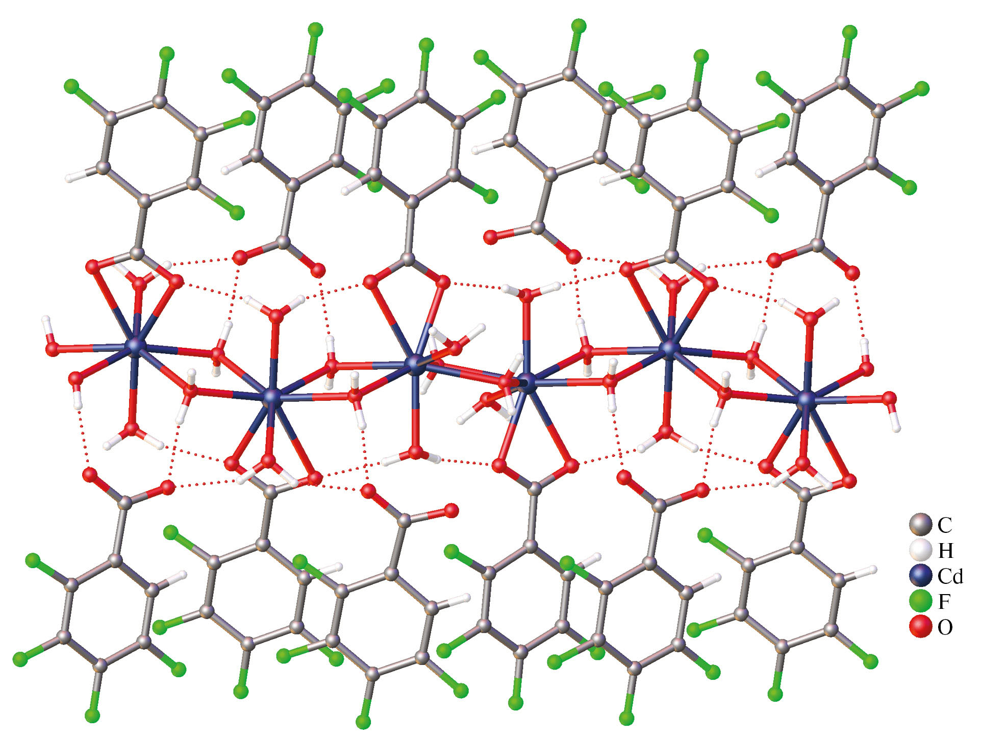 По данным рентгеноструктурного анализа ионное соединение [Cd(6Htfb)(H2O)3]n · · n(6Htfb) · 2nH2O (I) образовано катионным цепочечным 1D-координационным полимером {Cd(H2O)4(6Htfb)}n+, в структуре которого соседние ионы кадмия связаны друг с другом двумя мостиковыми молекулами воды. Ионы кадмия достраивают свое окружение до квадратной антипризмы (CdO8, CShM = 1.445) координацией хелатно связанного аниона 6Htfb и двух монодентатно связанных молекул воды. Компенсация положительного заряда катионной цепочки происходит за счет не участвующего в координации к иону металла аниона 6Htfb, который связан водородными связями с координированными к ионам кадмия молекулами воды (см. табл. 2). Координированные и сольватные молекулы воды, а также атомы кислорода и фтора анионов 6Htfb задействованы в водородном связывании с формированием супрамолекулярного 2D-слоя (см. табл. 2, рис. 1). Также полимерная цепь дополнительно стабилизирована за счет C–F···π-взаимодействий (см. табл. 4, рис. 2) и π···π-взаимодействий между парами 6Htfb анионов. Основные длины связей и расстояния приведены в табл. 5.