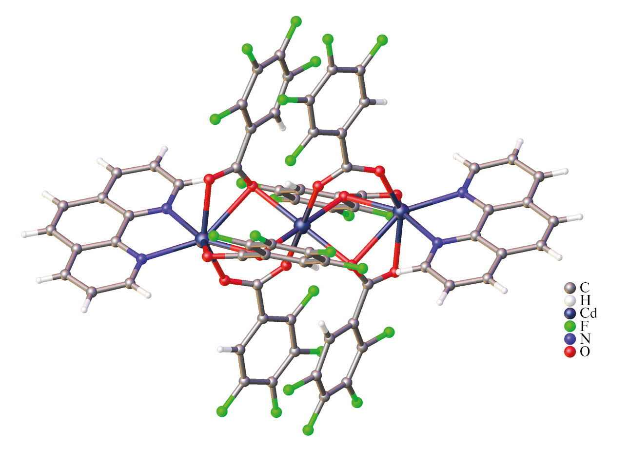 Ранее нами было показано, что строение фрагмента {Cd2(Рhen)2(6Htfb)4} в 2,3,4,5-тетрафторбензойном комплексе [Cd2(Н2О)2(Рhen)2(6Htfb)4] практически такое же, как у биядерного фрагмента пентафторбензоатного координационного полимера {Cd2(Phen)2(Рfb)4}n [14]. Представлялось интересным выяснить, приведет ли отсутствие воды в реакционной смеси к выделению соединения аналогичного пентафторбензоатному полимеру. Нами были предприняты попытки получения 2,3,4,5-тетрафторбензоатного комплекса кадмия с 1,10-фенантролином из безводной соли, обезвоженного ацетонитрила и в инертной атмосфере. Безводный 2,3,4,5-тетрафторбензоат кадмия получали из соли [Cd(6Htfb)(H2O)3]n . n(6Htfb) . 2nH2O (I) нагреванием при 100°C в течение 10 ч в динамическом вакууме. Однако удаление молекул воды из реакционной смеси привело к формированию молекулярного трехъядерного комплекса [Cd3(Рhen)2(6Htfb)6] (II).