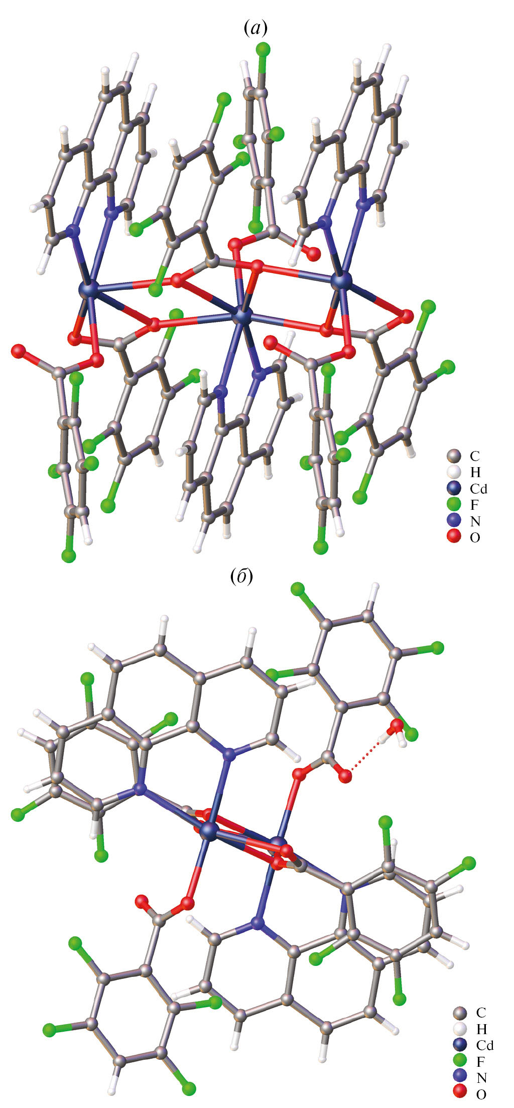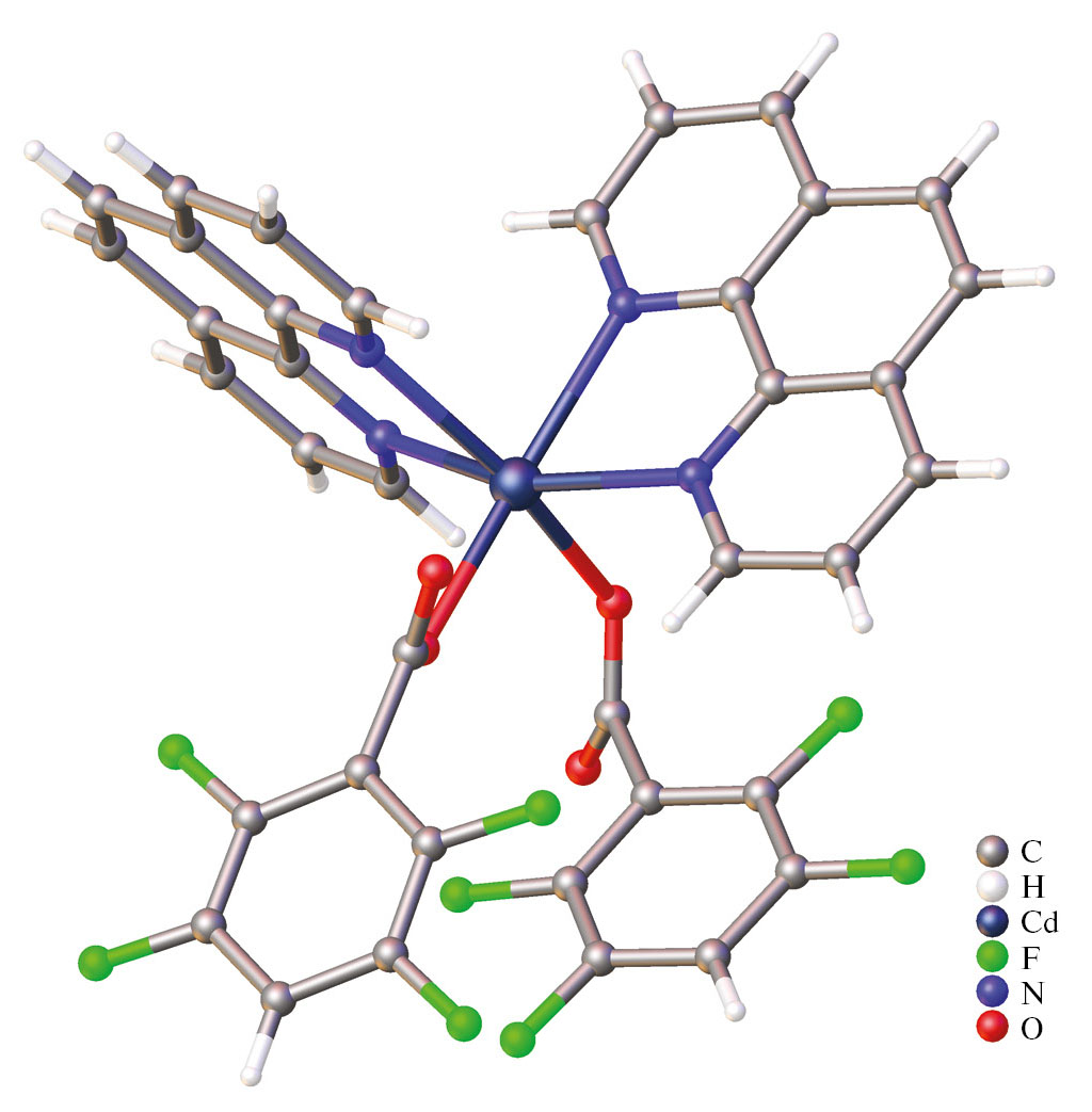 Химическое поведение карбоксилатных комплексов 3d-металлов и кадмия имеет много общих черт. Отличия прежде всего связаны с большими координационными числами и большими длинами связей, которые ионы кадмия образуют с донорными атомами координационного окружения. Это, в свою очередь, отражается в заметно более выраженной по сравнению с 3d-металлами склонностью кадмия к образованию координационных полимеров [1–3]. Вклад различных нековалентных взаимодействий в стабилизацию полимерных структур может заметно усиливать эту тенденцию [4, 5], а появление стерических затруднений – ей препятствовать [6–10]. В качестве одного из типов нековалентных взаимодействий можно указать стэкинг-взаимодействия ареновых и перфторареновых фрагментов. Эти взаимодействия были изучены на примере сокристаллизатов гексафторбензола с бензолом и других систем арен–перфторарен [11–13]. При одновременной координации гетероциклических ароматических N-донорных лигандов и пентафторбензоатных анионов к одному иону металла мы наблюдали формирование аналогичных нековалентных взаимодействий [14–17], как и в случае вышеупомянутых органических сокристаллизатов. При этом фиксация лигандов на металлоцентрах позволяет достичь большего структурного разнообразия по сравнению с сокристаллизатами свободных органических молекул, а сам процесс создания заданных сочетаний ароматических фрагментов разной природы становится в гораздо большей степени управляемым. Сочетание пентафторбензоатных анионов и N-донорных ароматических лигандов в гомометаллических или гетерометаллических комплексах кадмия, как правило, приводит к сближению и параллельному, стопочному расположению ароматических фрагментов, что, в свою очередь, приводит к разблокированию металлоцентров и формированию координационных полимеров различного состава и строения [14–17]. Особенностью этих полимеров является то, что они сформированы из мономерных фрагментов, имеющих состав характерный для известных молекулярных комплексов [18–24]. Однако эти структурные блоки имеют совершенно иное строение и искажены так, чтобы лиганды не препятствовали формированию цепи координационного полимера, они как бы “сплющены” и предорганизованы для связывания в полимерную структуру. Совершенно очевидно, что такие “сплюснутые” фрагменты не могут существовать в форме соответствующих устойчивых молекулярных комплексов, поскольку металлоцентры в местах обрыва полимерной цепи окажутся координационно ненасыщенными. Показателен пример 2,3,4,5-тетрафторбензоатных (6Htfb) комплексов кадмия [Cd2(Н2О)2(Рhen)2(6Htfb)4] и [Cd2(Н2О)2(Quin)2(6Htfb)4] (Рhen = 1,10-фенантролин; Quin = хинолин), ароматические циклы лигандов ориентированы параллельно, а биядерные металлофрагменты {Cd2(Hhen)2(6Htfb)4} и {Cd2(Quin)2(6Htfb)4} имеют аналогичное строение, что и пентафторбензоатные фрагменты [14]. Но вместо образования координационных полимеров происходила координация молекул воды к разблокированным металлоцентрам, а также образование биядерных молекулярных комплексов.