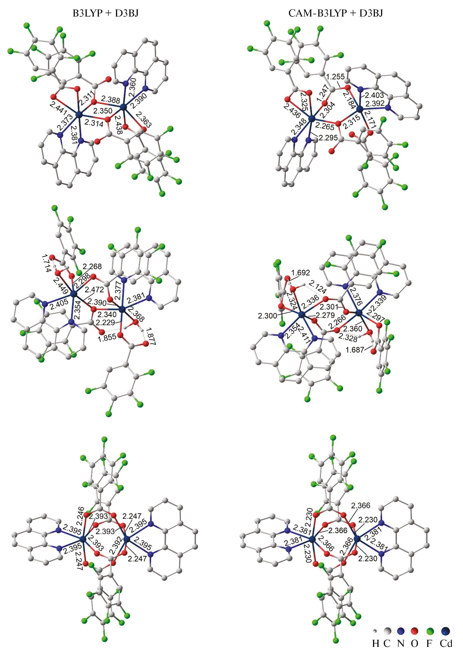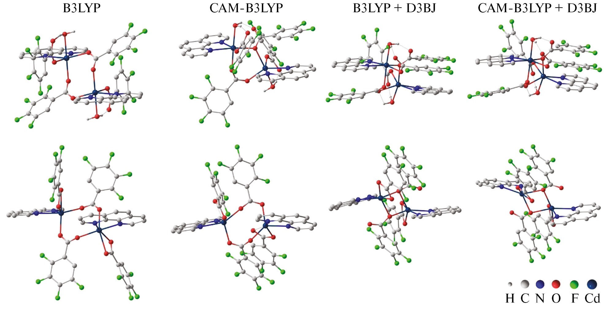 Квантово-химические расчеты выполнены с помощью программы Гауссиан 16 [30] методом теории функционала плотности (DFT) [31] с использованием функционала B3LYP [32], хорошо зарекомендовавшего себя при изучении аналогичных биядерных карбоксилатных комплексов металлов [33–35], и валентно-расщепленного базиса с включением поляризационные и диффузные функций Def2-TZVP, обеспечивающего разумный компромисс между уровнем приближения и временем проведения расчетов. Вследствие высокой стереохимической нежесткости исследуемых комплексов для моделирования эффектов упаковки использовались эмпирические поправки Гримме D3BJ [36], функционал CAM-B3LYP [37], позволяющий описывать дальнодействующие взаимодействия, а также комбинация этих подходов. Обсуждаемые в статье структуры комплексов вычислены посредством полной оптимизации геометрии без наложения симметричных ограничений c проверкой устойчивости волновой функции. На предварительном этапе расчеты были выполнены в базисе Def2-SVP, рассчитанные структуры получены с использование валентно-расщепленного базиса Def2-TZVP. Графические изображения молекулярных структур получали с помощью программы ChemCraft [38].