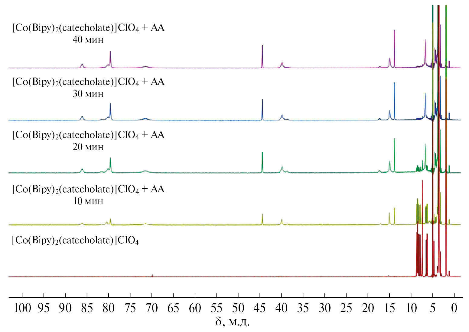 На рис. 3 приведены спектры ЯМР 1Н, иллюстрирующие динамику процесса восстановления комплекса II аскорбиновой кислотой в атмосфере аргона. Данный процесс приводил к образованию комплексов, содержащих парамагнитный ион Co2+, в связи с чем в спектрах ЯМР 1Н можно было выделить диамагнитную (от 0 до 10 м.д.) и парамагнитную (от 15 до 120 м.д.) области. Первая содержала сигналы исходного комплекса, аскорбиновой кислоты, продукта ее окисления и свободного пирокатехина, а вторая – сигналы образующихся комплексов кобальта(II). Видно, что по мере протекания реакции интенсивность сигналов в диамагнитной области уменьшается, а в парамагнитной, наоборот, увеличивается. При этом количество наблюдаемых сигналов в парамагнитной области спектра оставалось постоянным в процессе восстановления, а менялась только их относительная интенсивность. Oтметим, что парамагнитные области спектров ЯМР, зарегистрированных спустя 40 мин после инициирования реакции восстановления комплексов кобальта(III) I и II, содержали восемь сигналов, значения химических сдвигов для которых совпадали (рис. 4). В спектре продуктов восстановления комплекса II обнаружено три дополнительных сигнала с низкой интенсивностью. Однако такие же сигналы появлялись и в спектрах смеси I с аскорбиновой кислотой спустя несколько часов после начала реакции. Совпадение значений химических сдвигов для сигналов в парамагнитной области указывало на то, что комплексы кобальта(II) состава [Co(Bipy)2(L)]2+А–2, где L – дианион 2-оксо-2Н-хромен-6,7-диолат или катехолат, а А– – противоион, не накапливаются в реакционной смеси. Из сравнения полученных спектров со спектром комплекса кобальта(III) [Co(Bipy)3](ClO4)2, зарегистрированным в ацетонитриле-d3, видно, что наиболее интенсивные сигналы совпадают с сигналами в спектре указанного комплекса (см. рис. 4, отмечены *). Из анализа полученных данных можно сделать вывод, что восстановление комплексов кобальта(III) I и II аскорбиновой кислотой сопровождается образованием комплекса кобальта(II) [Co(Bipy)3](ClO4)2 в качестве основного продукта. Масс-спектры реакционных смесей (рис. 5) наряду с сигналами, соответствующими исходным комплексным ионам [Co(Bipy)2(L)]+, содержали сигналы с m/z 263.6, 405.9 и 470.2, относящиеся к ионам [Co(Bipy)3]2+, [Co(Bipy)2Cl]+ [Co(Bipy)2(ClO4)]+. Появление в масс-спектре аддуктов с хлорид-анионом может быть связано с неполной заменой хлорид-иона на перхлорат при синтезе исследованных комплексов из [Co(Bipy)2Cl2]Cl. Данные спектроскопии ЯМР и масс-спектрометрии подтверждают механизм восстановления, представленный на схеме 2.
