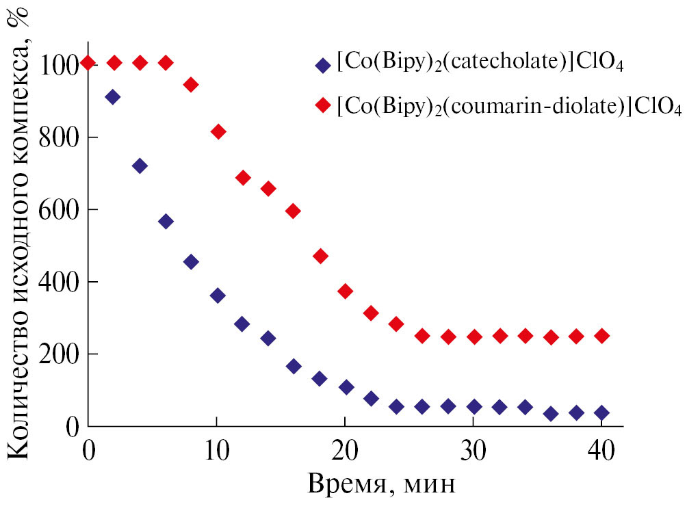 В настоящей работе с использованием предложенного подхода мы исследовали зависимость скорости редокс-активируемого высвобождения модельных лекарственных препаратов комплексами кобальта от молекулярной структуры высвобождаемых препаратов. В качестве объектов исследования выбраны редокс-активные комплексы кобальта(III) [Co(Bipy)2(coumarin-diolate)]ClO4 (I) и [Co(Bipy)2(catecholate)]ClO4 (II) [9, 12], содержащие в качестве лигандов бипиридин и дианион 2-оксо-2Н-хромен-6,7-диолат или катехолат (схема 1). Выбор комплекса I обусловлен его перспективными биологическими свойствами. Так, ранее была продемонстрирована цитотоксичность комплекса I по отношению к клеткам рака кишечника в условиях гипоксии [9]. Комплекс II выбран для удобства сравнения. Пирокатехин, дианион которого входит в состав II, содержит структурный фрагмент, аналогичный фрагменту, входящему в состав 6,7-дигидроксикумарина. К тому же пирокатехиновый фрагмент входит в состав многих биологически активных препаратов – антиоксидантов, адреналина и др.