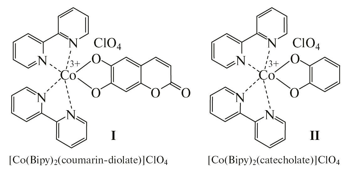 Общая процедура синтеза комплексов [Co(Bipy)2(coumarin-diolate)]ClO4 (I) и [Co(Bipy)2(catecholate)]ClO4 (II). К раствору [Co(Bipy)2Cl2]Cl (0.5 ммоль, 221.1 мг) в 15 мл метанола добавляли раствор триэтиламина (1 ммоль, 101.2 мг, 139 мкл) и соответствующего дигидроксисоединения (6,7-дигидроксикумарина (0.5 ммоль, 89 мг) или пирокатехина (0.5 ммоль, 55 мг)) в 10 мл метанола. Полученную смесь кипятили в течение 3 ч, затем охлаждали до комнатной температуры, добавляли раствор перхлората лития (1.25 ммоль, 133 мг) в 5 мл метанола и перемешивали 30 мин при охлаждении на водяной бане для кристаллизации целевых комплексов. Образовавшийся зеленый осадок отделяли фильтрованием, промывали изопропанолом и диэтиловым эфиром и высушивали при пониженном давлении.