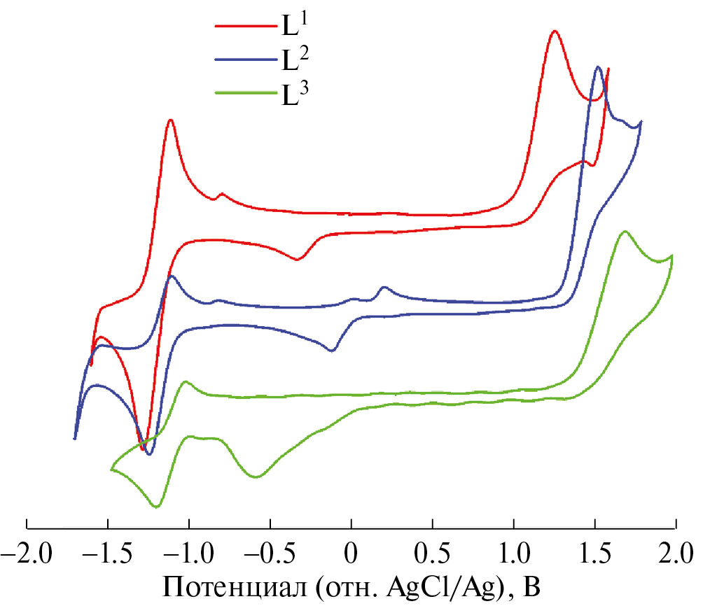 Рис. 3. Кривые ЦВА соединений L1–L3 в диапазоне потенциалов от –1.6 до 1.7 В (для L1); –1.75 до 1.8 В (для L2); –1.5 до 2.0 В (для L3) (CH2Cl2, СУ-электрод, c(L1–L3) = 8 × 10–4–2 × 10–3 M, v = 100 мВ/с, 0.1 М nBu4NPF6, отн. Ag/AgCl))