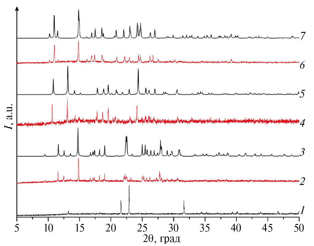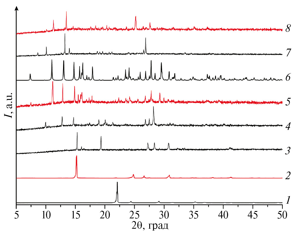 Рентгенофазовый анализ (РФА) образцов проводили на дифрактометре Bruker D8 ADVANCE (CuKα-излучение) в диапазоне углов 2θ = 5°–80° с шагом по 2θ = 0.01125° и выдержкой не менее 0.15 с/шаг. Дифрактограммы индицировали с использованием базы данных PDF2 (version 2022).
