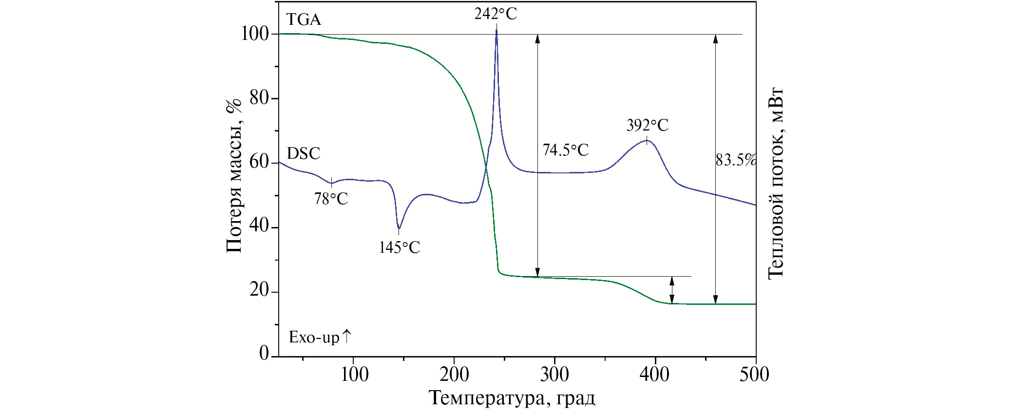 На термограмме соединения I наблюдается незначительный эндоэффект с максимумом при 78°С, что может быть связано с удалением адсорбированной воды, после чего наступает плавление (максимум при 145°С). В интервале температур 220–280°С (максимум при 242°С) наблюдается выраженный экзотермический эффект, сопровождающийся значительной потерей массы, что соответствует протеканию реакции горения. Экзоэффект с максимумом при 392°С отвечает окислению оставшихся органических частиц. Общая потеря массы при температуре 500°С составляет около 84%, что соответствует образованию CoO1–δ, при охлаждении которого в атмосфере воздуха происходит образование Co3O4.