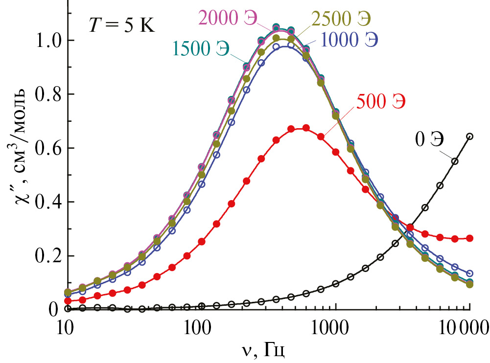 В случае выхода максимума на зависимости χ˝(ν) при варьировании напряженности магнитного поля ниже низкочастотного предела (рис. 3), доступного на используемом оборудовании (например, в случае оборудования фирмы Quantum Design, PPMS-9 — 10 Гц; для MPMS-XL — 0.1 Гц), следует производить поиск оптимального значения Hdc при более высокой температуре (например — 5 K, рис. 2), для которой имеющиеся максимумы на χ˝(ν) возможно наблюдать в интервале рабочих частот используемого оборудования (для PPMS-9 — 10–10000 Гц; для MPMS-XL — 0.1–1500 Гц).