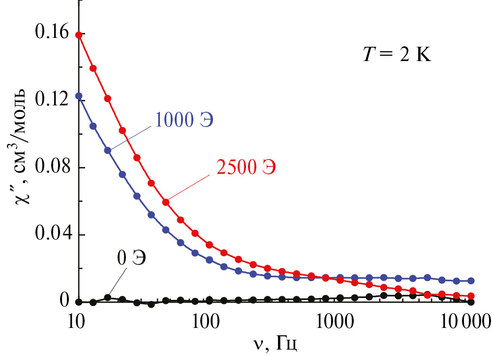 При исследовании динамики магнитного поведения с целью получения информации о наличии и параметрах магнитной релаксации в исследуемом комплексном соединении, в первую очередь, следует производить измерения частотных зависимостей динамической магнитной восприимчивости (действительной χ´(ν) и мнимой χ˝(ν) компонент) в нулевом магнитном поле, а также магнитных полях различной напряженности при минимально возможной температуре эксперимента. Наиболее характерными значениями напряженности магнитного поля Hdc, при которых проводят измерения χас: 0, 500, 1000, 1500, 2000, 2500, 5000 Э. Минимальная достаточно стабильная температура эксперимента на оборудовании фирмы Quantum Design — 2 К (температуры ниже температуры кипения жидкого гелия 4.2 K получают методом откачки паров гелия). На первом этапе с целью оптимизации времени эксперимента измерения проводят при напряженностях магнитного поля, кратных 1000 Э. При отсутствии отличных от нулевых значений χ˝ эксперимент прекращают. Следует иметь в виду, что критерием отличия от нулевых значений χ˝ следует считать χ˝ ≥ χ´/10 в одинаковых единицах измерения, т.е. величины χ˝, которые были не более чем в 10 раз меньше значений χ´ при той же частоте, температуре, амплитуде модуляции и напряженности внешнего магнитного поля (для примера см. далее рисунки, на которых представлены χ´ и χ˝).