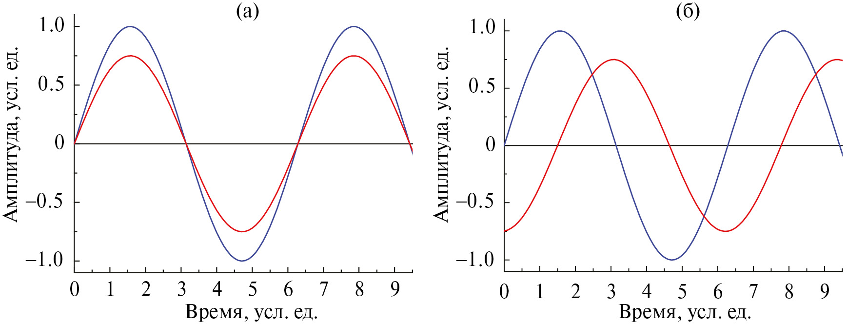 Рис. 1. Изменение намагниченности образца (красная линия) относительно изменения амплитуды переменного магнитного поля (синяя линия). Быстрая магнитная релаксация (намагниченность образца изменяется синфазно изменению напряженности внешнего магнитного поля) (а); медленная магнитная релаксация (наблюдается отставание по фазе измеряемого сигнала от приложенного переменного магнитного поля) (б).