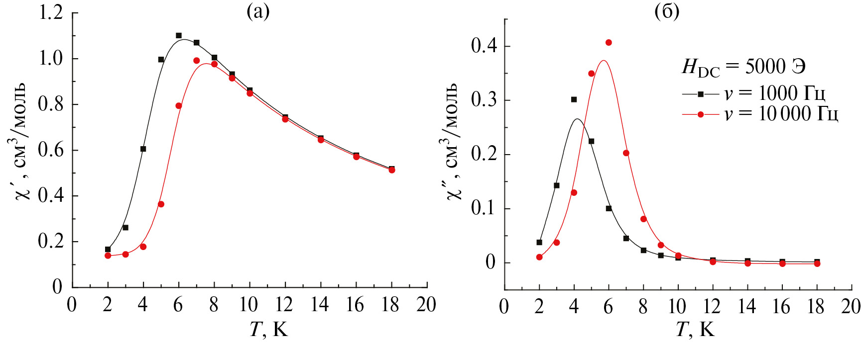 Рис. 6. Температурные зависимости χ´ (а) и χ˝ (б) для комплекса [Er(H₂O)₆Cl₂]Cl [48].