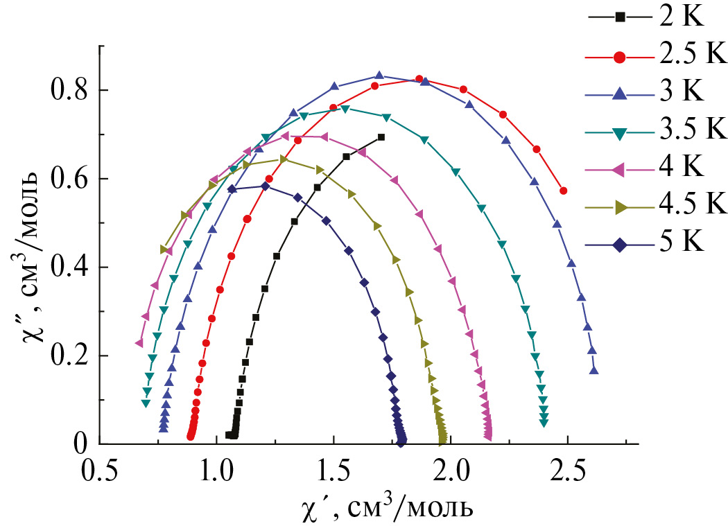 Рис. 7. Зависимости Коула–Коула для комплекса [Er(H₂O)₆Cl₂]Cl в магнитном поле 1000 Э и диапазоне температур 2–5 K. Построено с изменениями по данным работы [48].