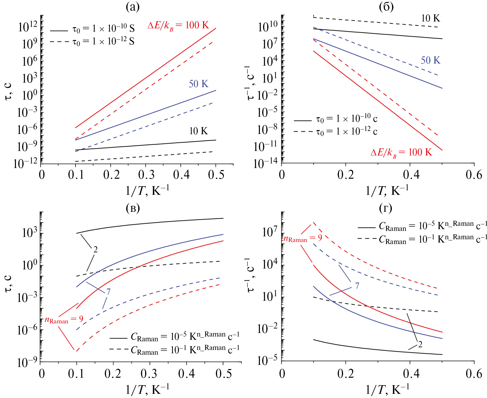 Изображение зависимости времени релаксации от температуры возможно в различном виде: τ(T), τ(1/T), 1/τ(T), 1/τ(1/T), logτ(1/T), logτ(logT) и др. Приоритетным считается изображение данной зависимости в виде τ(1/T) с использованием логарифмической шкалы по оси времени релаксации. Такое построение позволяет выявить наиболее интересующий исследователей Орбаховский механизм релаксации, который в данной системе координат будет выглядеть как прямая линия. Аналогичный вид будет и для зависимости в виде logτ(1/T), однако преимуществом построения зависимости в виде τ(1/T) в полулогарифмической системе координат является возможность определения параметра τ0 мысленным продлением линейного участка зависимости до пересечения с осью времени релаксации (предел бесконечно большой температуры) – точка пересечения будет соответствовать времени наискорейшей релаксации системы по механизму Орбаха, т.е. параметру τ0. При решающем влиянии механизма Рамана линейная зависимость времени релаксации от температуры будет наблюдаться для построения графика времени релаксации от температуры с логарифмическими шкалами по обеим осям. Виды зависимостей времени релаксации от температуры для механизмов Орбаха и Рамана с разным набором параметров релаксации приведены на рис. 8 и S1.