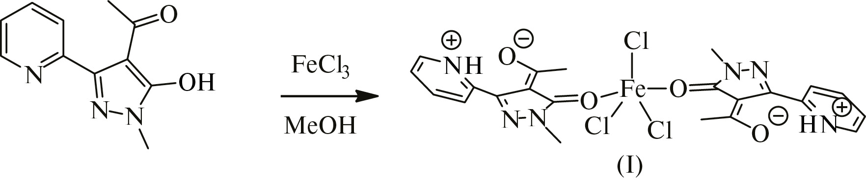 Предложенный дизайн ацилпиразолонового лиганда позволил нам получить первый пример комплекса железа(III) FeL₂Cl₃ (I), в котором такой лиганд — 1-(5-гидрокси-1-метил-3-(пиридин-2-ил)-1Н-пиразол-4-ил)этан-1-он (L) — координирован ионом металла к β-дикетонатному фрагменту по редко встречаемому η1-типу (cхема 3).