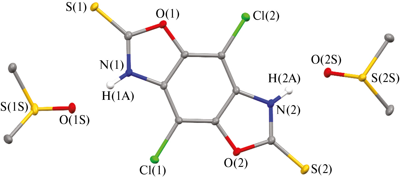 Синтез 4,8-дихлорбензо[1,2-d:4,5-d´]бис(оксазол)-2,6(3H,7H)-дитиона (H₂L). В колбу объемом 50 мл помещали 15 мл ДМСО, 2,5-диамино36-дихлор-1,4-бензхинон (1 г, 4.83 ммоль), сероуглерод (1.5 мл, 24.94 ммоль) и девятиводный сульфид натрия (1.159 г, 4.83 ммоль). Смесь нагревали в масляной бане с обратным холодильником при температуре 100oC при интенсивном перемешивании на магнитной мешалке в течение 12 ч в атмосфере аргона. Наблюдали потемнение бежевого раствора до краснокоричневого цвета. Смесь охлаждали до комнатной температуры, добавляли 15 мл водного раствора NaOH (1 г) и перемешивали в течение 30 мин до выпадения серы. Осадок серы отфильтровывали на фильтре Шотта и добавляли 1Н НCl до кислой среды (pH 3–4). Полученный творожистый осадок отфильтровывали и промывали водой, сушили в вакууме при 100оС в течение 2 ч. Выделяли H₂L в виде серобурого порошка с выходом 1.26 г (89%). Кристаллы H₂L · 2ДМСО получали при медленном охлаждении горячего насыщенного раствора H₂L в ДМСО.