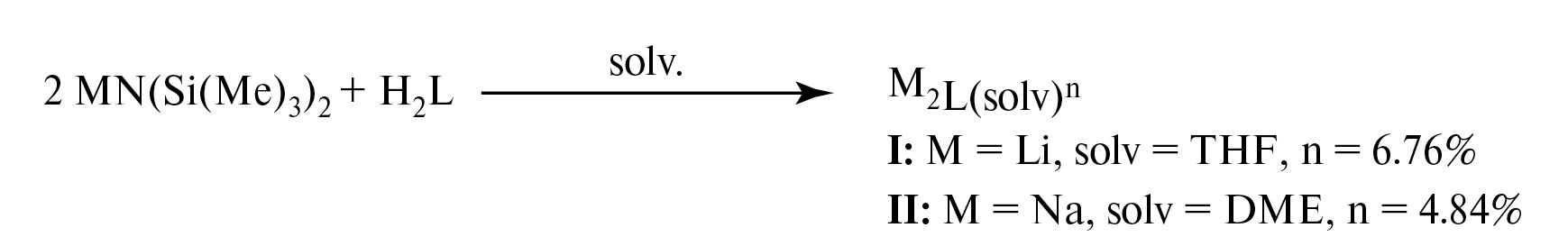 С целью синтеза координационных полимеров на основе ионов щелочных металлов были проведены реакции силиамидных комплексов натрия и лития с H₂L в соответствии со схемой 2. Однако на основании данных РСА было установлено, что образующиеся в таких реакциях бесцветные кристаллы соединений I и II представляют собой биядерные молекулярные комплексы M2L(solv)n, где M = Li, Na, solv = ТГФ (n = 6), ДМЭ (n = 4).