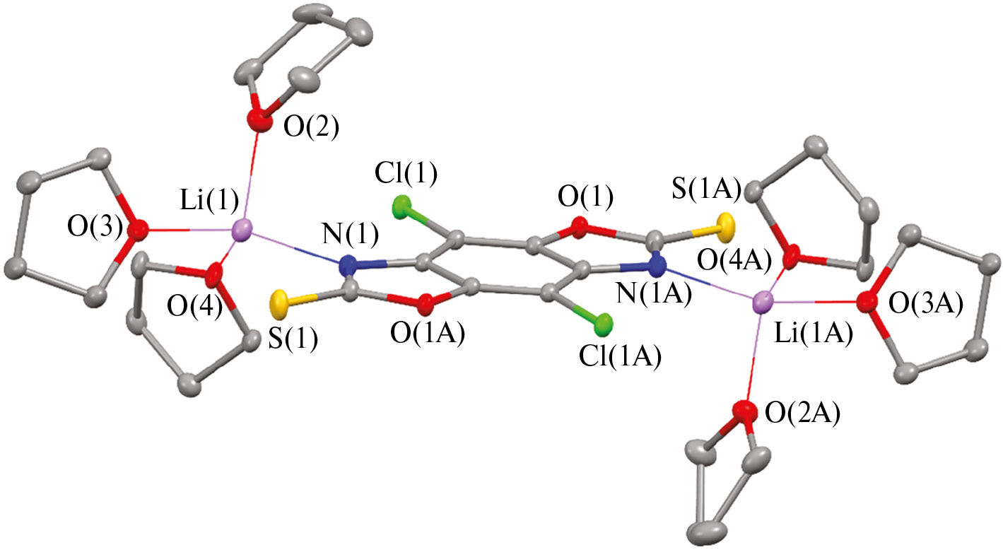 Соединение I представляет собой биядерный комплекс лития, в котором каждый атом металла связан с одним атомом азота бисмеркаптооксазола и тремя молекулами ТГФ (рис. 3). Длина связи Li(1)–N(1) составляет 2.077(4) Å. Координация лиганда приводит к некоторому увеличению связи C=S (1.673(2) Å) по сравнению со свободным лигандом (1.645(2) Å), однако расстояние Li…S (3.392(4) Å) значительно превышает сумму ионного радиуса атома лития (0.73 Å) [37] и ван-дер-ваальсового радиуса серы (1.8 Å) [38], что свидетельствует об отсутствии взаимодействия Li…S. Таким образом, координационное окружение атома лития представляет собой искаженный тетраэдр. Основные геометрические характеристики в координационной сфере атома лития (табл. 2 и 3) хорошо соответствуют значениям, наблюдаемым в ранее опубликованных родственных комплексах [39]. Бисмеркаптооксазол в комплексе I имеет плоское строение. Максимальное отклонение от плоскости составляет 0.033 Å.
