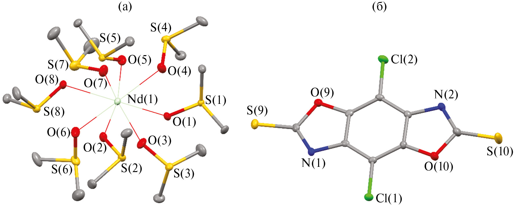 Согласно данным РСА, строение комплекса III аналогично ранее опубликованному комплексу неодима с родственным бистиазольным лигандом [22]. Соединение III представляет собой комплекс, содержащий катионную Nd3+(ДМСО)8 и анионные L2– части: три дианиона бисмеркаптооксазола на две катионные части в кристалле. Молекулярная структура комплекса III показана на рис. 5.