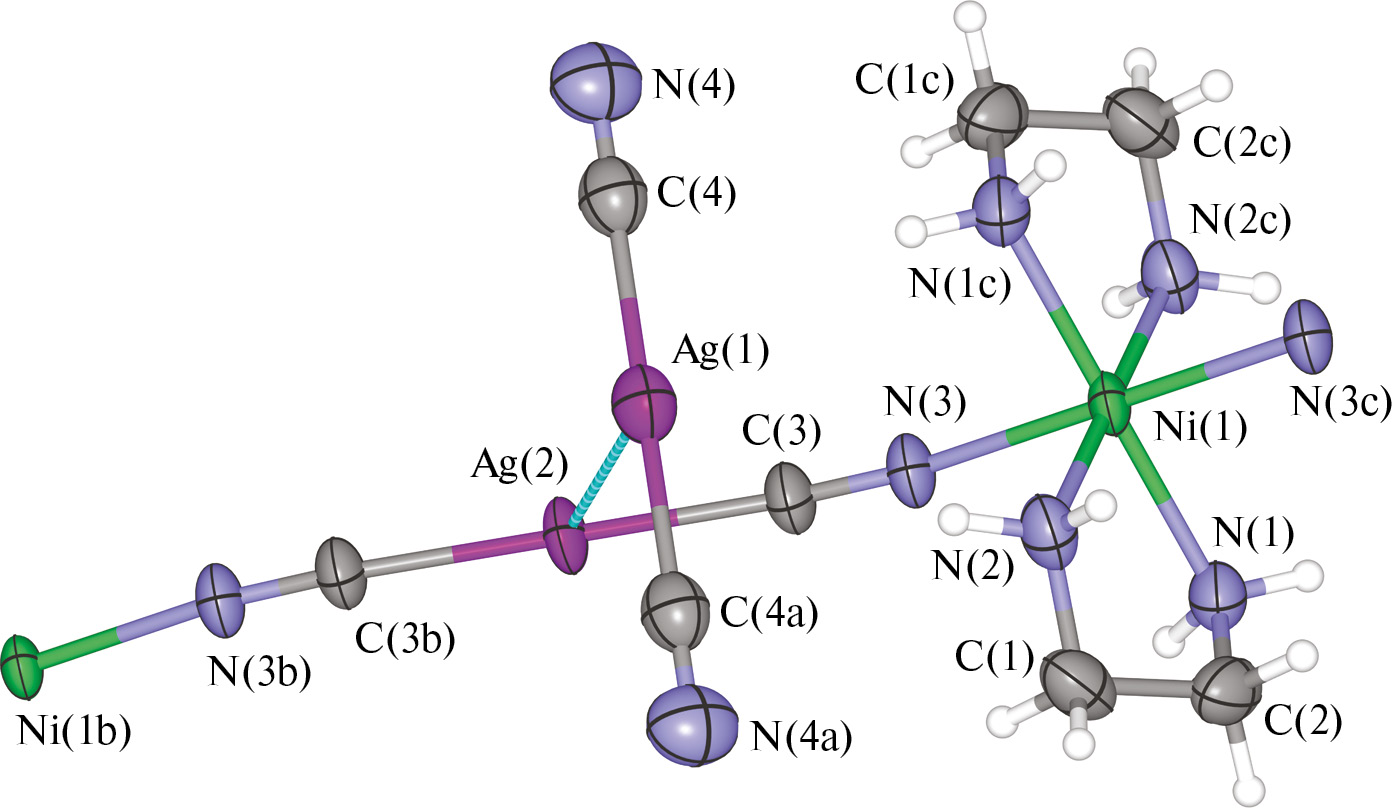 Расстояния M–N в продуктах I и II варьируются в различных пределах. Для комплекса I интервал значений относительно невелик и составляет 2.088(6)–2.138(5) Å, наибольшее из которых относится к координационной связи Ni-центра с мостиковым анионом [Ag(CN)2]– (Ni(1)–N(3)). Другая картина наблюдается для комплекса [Cu(En)2(Ag(CN)2)][Ag(CN)2] (II). Расстояния между катионами Cu2+ и атомами азота мостиков [Ag(CN)2]– значимо превышают расстояния между катионами Cu2+ и атомами азота молекул этилендиамина: 2.578 против 2.029(2) Å.