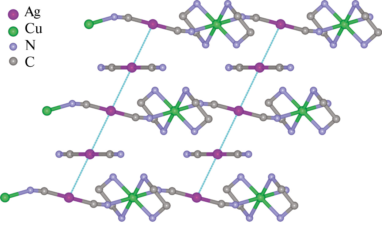 Стоит отметить, что близостью значений длин связей Ag–C и C≡N для координированного и некоординированного типов [Ag(CN)2]– (2.064(4) и 1.124(6) против 2.054(3) и 1.125(5) Å соответственно), а также значительным удлинением расстояний Cu–Nакс (2.578 Å) авторы работы [26] объясняют, почему присутствие формально мостиковых цианогрупп в кристалле II не дает соответствующей полосы поглощения ниже 2150 см–1 в ИК-спектре данного соединения.