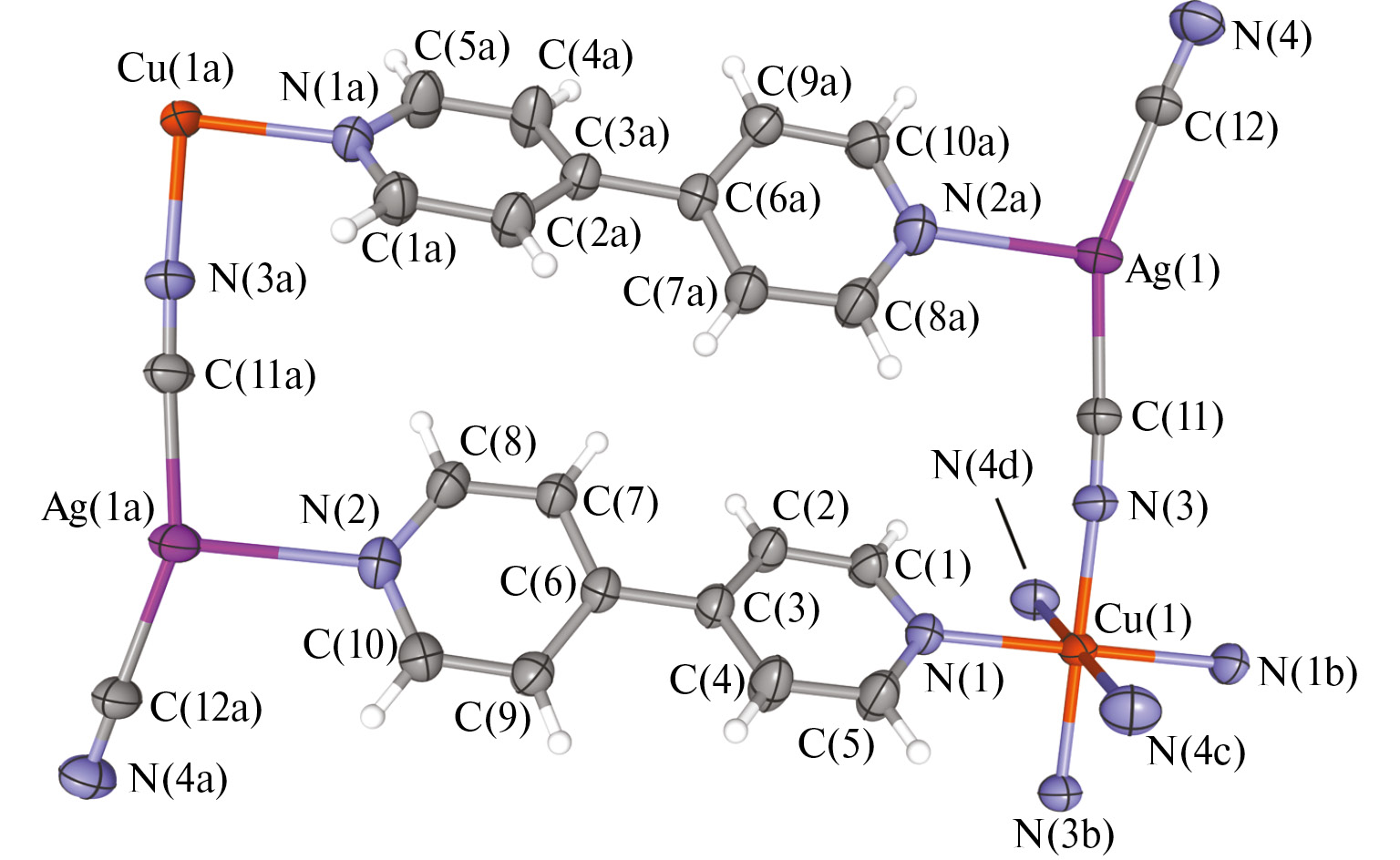 Геометрия ионов [Ag(CN)2]– в данном комплексе значимо отличается от линейной вследствие сближения атомов серебра с атомами азота из 4,4´-бипиридильных лигандов. Ag-центры, таким образом, являются трехкоординированными, с расстояниями Ag(1)–N(2a), Ag(1)–C(11) и Ag(1)–C(12) равными 2.4841(18), 2.0955(16) и 2.0881(16) Å соответственно; угол C(11)Ag(1)C(12) уменьшается до 157.32(6)°. Длины тройных связей C(11)–N(3) и C(12)–N(4) в анионах неравнозначны: 1.1453(19) и 1.137(2) Å. Внутри каждого слоя {Cu[Ag(CN)2]2}n также присутствует неоднородность расстояний Cu–N: длина связи Cu(1)–N(3) равна 1.9615(14) Å, в то время как расстояние Cu(1)–N(4) значимо длиннее и составляет 2.568 Å. Различиями в длинах связей Ag–C, C≡N и Cu–N можно объяснить появление двух полос поглощения цианогрупп в ИК-спектре продукта, несмотря на то что в кристалле III формально присутствует только один тип дицианоаргентатных анионов. Два оставшихся места в октаэдрическом окружении катионов Cu2+ занимают атомы азота двух 4,4´-бипиридильных лигандов; длина связи Cu(1)–N(1) составляет 2.0636(15) Å.