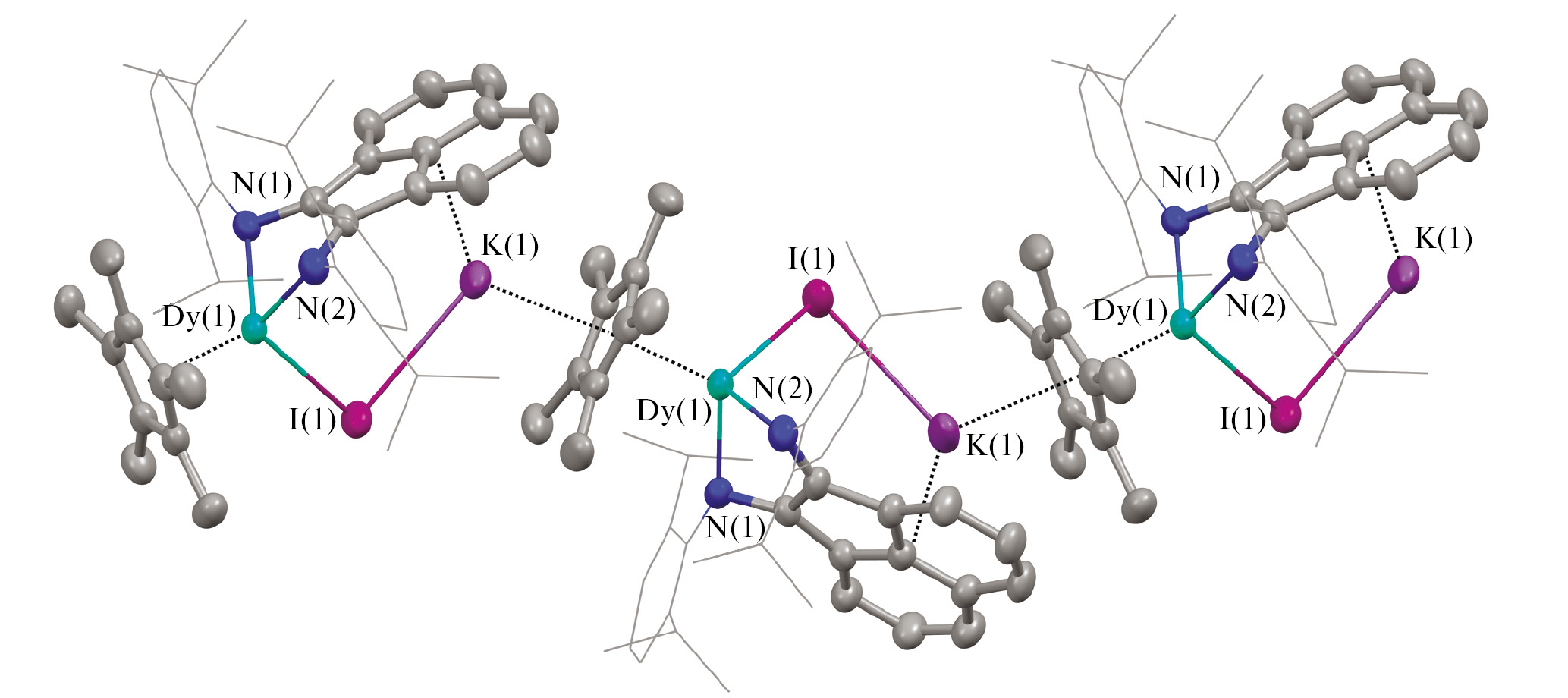 По данным РСА, соединение I представляет собой 1D-координационный полимер (рис. 3) и состоит из бесконечных одномерных зигзагообразных цепей. Сборка полимера происходит за счет связывания фрагмента {(Dpp-bian)Dy} одновременно с пентаметилциклопентадиенильным лигандом и ионной парой KI, которые выступают в качестве линкеров. В соединении I Dpp-bian лиганд находится в дианионном состоянии, что подтверждают длины связей в дииминовом фрагменте N(1)C(1)C(2)N(2: (N(1)–C(1) 1.401(10), N(2)–C(2) 1.376(11), C(1)–C(2) 1.417(13) Å (табл. 2). Так, в комплексах лантаноидов с дианионом Dpp-bian упомянутые длины связей имеют значения 1.407(6), 1.391(6) и 1.418(6) Å соответственно для [(Dpp-bian)LaCp*(Thf)] [24] и 1.403(3), 1.397(3) и 1.384(3) Å для [(Dpp-bian)SmBr(Dme)]2 [20]. Расстояния Dy–N (2.187(7) и 2.214(7) Å) указывают на присутствие иона Dy3+ в продукте I [44]. Пятичленный металлоцикл в соединении I не плоский, значение двугранного угла между плоскостями NCCN и NDyN составляет 138.2°. Расстояния между атомом диспрозия и атомами углерода циклопентадиенильного лиганда лежат в узком интервале (2.637(9)–2.676(9) Å), что свидетельствует о h5-координации последнего. Расстояние Dy–Cpcentr (2.375 Å) меньше, чем в комплексе самария [(ArBIG-bian)SmICp*][K(Dme)4] (2.430 Å) [35] и соединениях лантана [(Dpp-bian)LaICp*][Na(18-crown-6)(Thf)2] и [(Dpp-bian)LaCp*(Thf)] (2.535 и 2.505 Å соответственно) [24]. Наблюдаемая зависимость отражает уменьшение ионного радиуса центрального атома при переходе от лантана к самарию и далее к диспрозию. В трис(пентаметилциклопентадиенил)диспрозии [Cp*3Dy], расстояние Dy–Cpcentr немного больше, чем в соединении I, а расстояния Dy–С(Cp) лежат в интервале 2.505–2.544 Å [45].