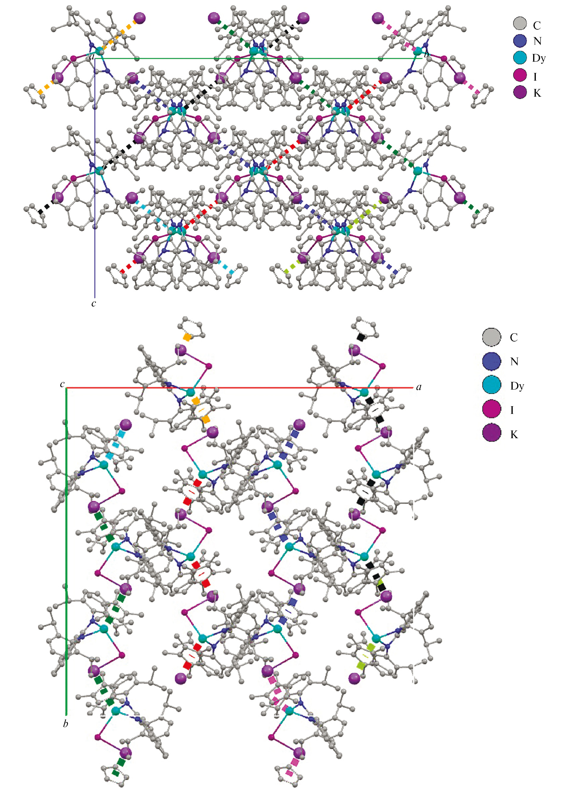 Синтез [(Dpp-bian)DyIKCp*]n (I) ∙ 2.6 C6H6. К избытку металлического диспрозия (30 г, 185 ммоль) в 30 мл ДМЭ добавляли 0.064 г (0.25 ммоль) I2 и 0.25 г (0.5 ммоль) Dpp-bian. Смесь нагревали при температуре 100°С в течение 3 ч. Цвет раствора изменился с оранжевого на синий. Полученный раствор отделяли фильтрованием и меняли растворитель на толуол (15 мл). К толуольному раствору добавляли 0.09 г (0.5 ммоль) Cp*K. Реакционную смесь нагревали в течение 30 мин до изменения цвета раствора на зеленый. Бесцветный осадок иодида калия отделяли центрифугированием, растворитель удаляли в вакууме, остаток растворяли в бензоле (4 мл). Из раствора получили зеленые кристаллы соединения I ∙ 2.6 C6H6, пригодные для РСА. Выход 0.15 г (26%).