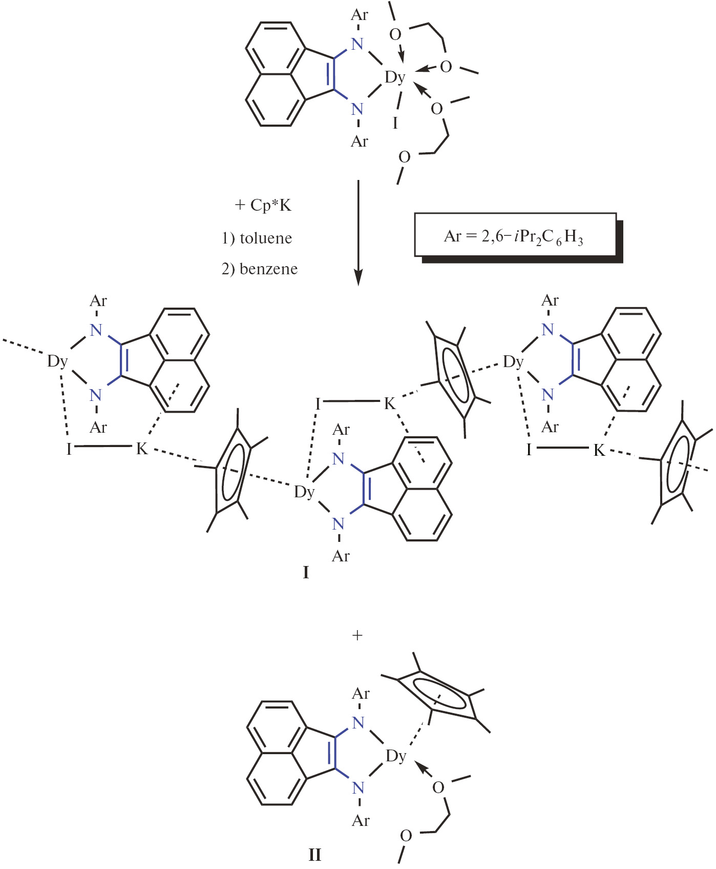 Взаимодействие эквимольных количеств [(Dpp-bian)DyI(Dme)2] [41] и Cp*K (Cp* = C5Me5) (cхема 1) в толуоле при кипячении в течение 30 мин приводит к изменению цвета раствора с синего на зеленый. Кристаллизацией из бензола получены соединения [(Dpp-bian)DyIKCp*]n (I) ∙ 2.6 C6H6 (26%) и [(Dpp-bian)DyCp*(Dme)] (II) ∙ 1.5 C6H6 (12%) в виде темных кристаллов.
